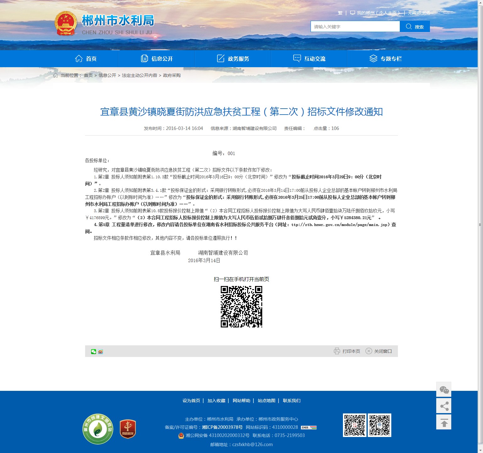 4.第5章 工程量清单进行修改,修改内容请各投标单位在湖南省水利招标投标公共服务平台(网址:ttp://ztb.hnwr.gov.cn/module/page/main.jsp)查阅。