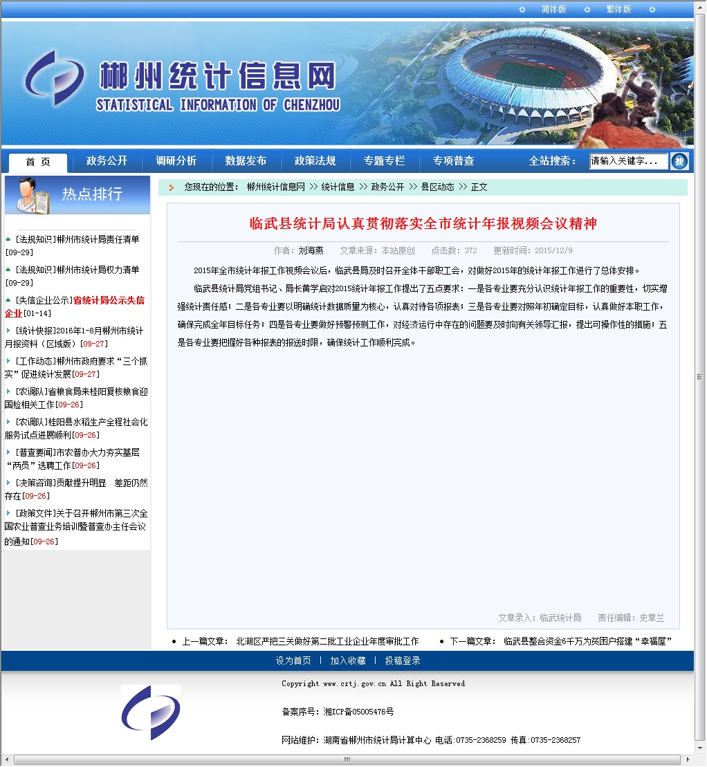 2015年全市统计年报工作视频会议后,临武县局及时召开全体干部职工会,对做好2015年的统计年报工作进行了总体安排。