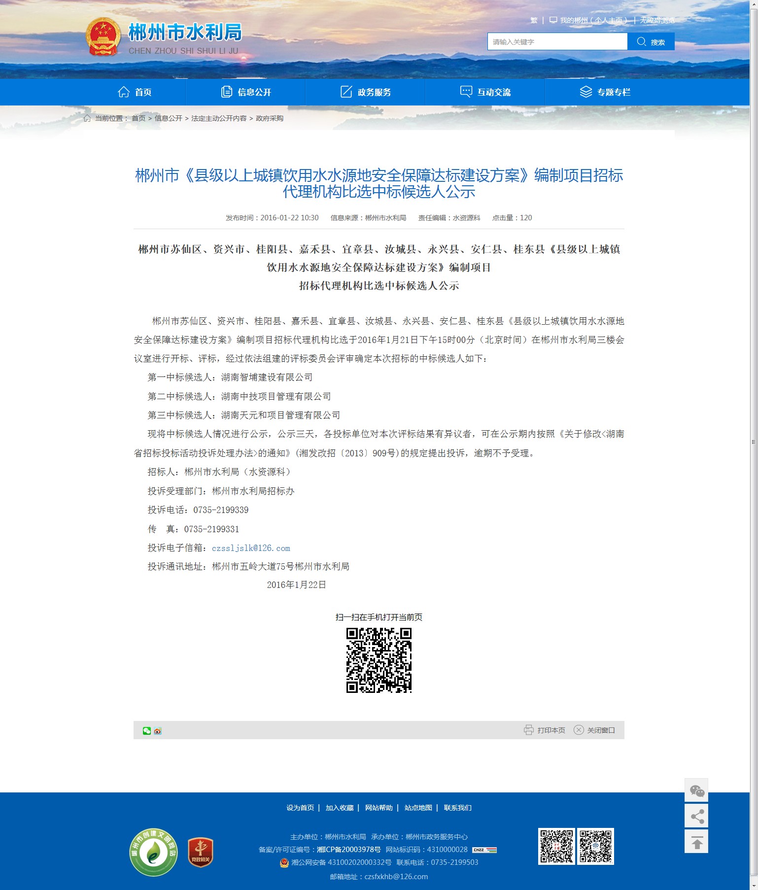 郴州市苏仙区、资兴市、桂阳县、嘉禾县、宜章县、汝城县、永兴县、安仁县、桂东县《县级以上城镇饮用水水源地安全保障达标建设方案》编制项目招标代理机构比选于2016年1月21日下午15时00分(北京时间)在郴州市水利局三楼会议室进行开标、评标,经过依法组建的评标委员会评审确定本次招标的中标候选人如下: