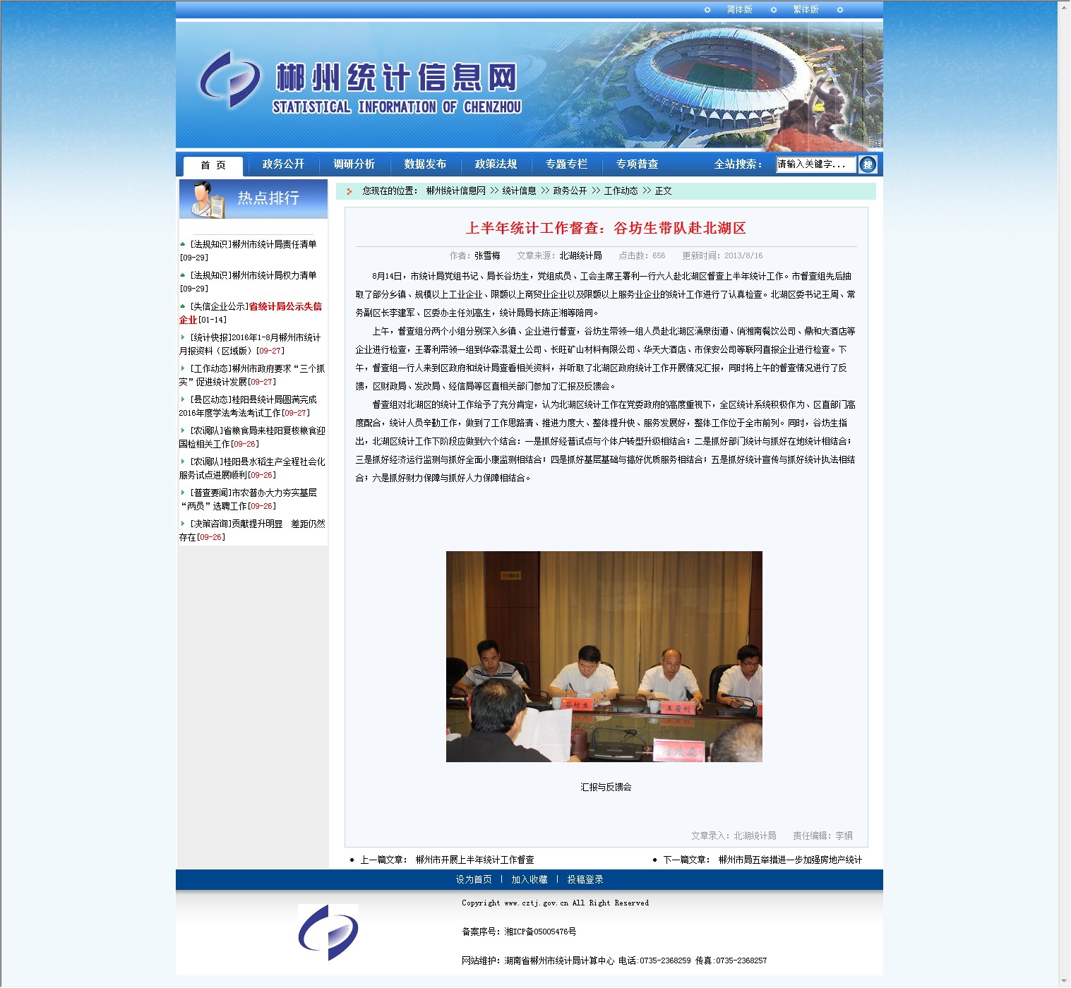 8月14日,市统计局党组书记、局长谷坊生,党组成员、工会主席王署利一行六人赴北湖区督查上半年统计工作。市督查组先后抽取了部分乡镇、规模以上工业企业、限额以上商贸业企业以及限额以上服务业企业的统计工作进行了认真检查。北湖区委书记王周、常务副区长李建军、区委办主任刘高生,统计局局长陈正湘等陪同。