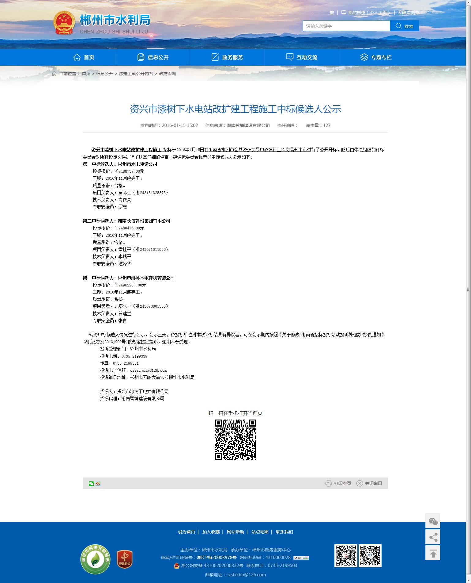 第三中标候选人:郴州市湘粤水电建筑安装公司