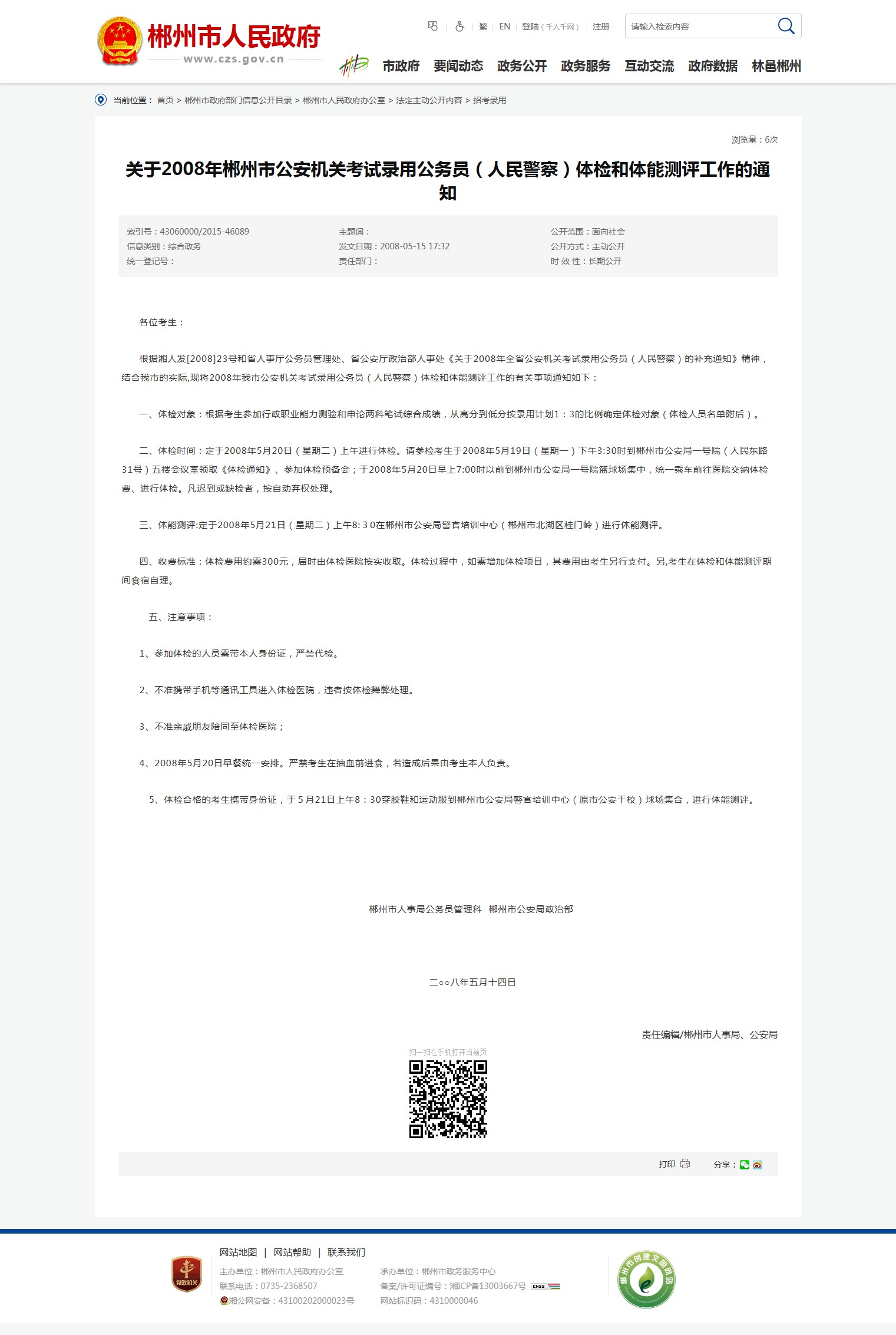 5、体检合格的考生携带身份证,于5月21日上午8:30穿胶鞋和运动服到郴州市公安局警官培训中心(原市公安干校)球场集合,进行体能测评。