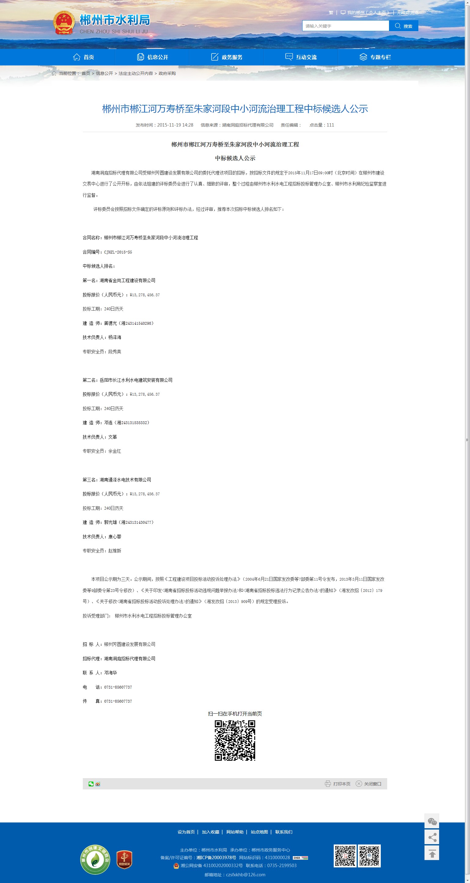 投诉受理部门: 郴州市水利水电工程招标投标管理办公室