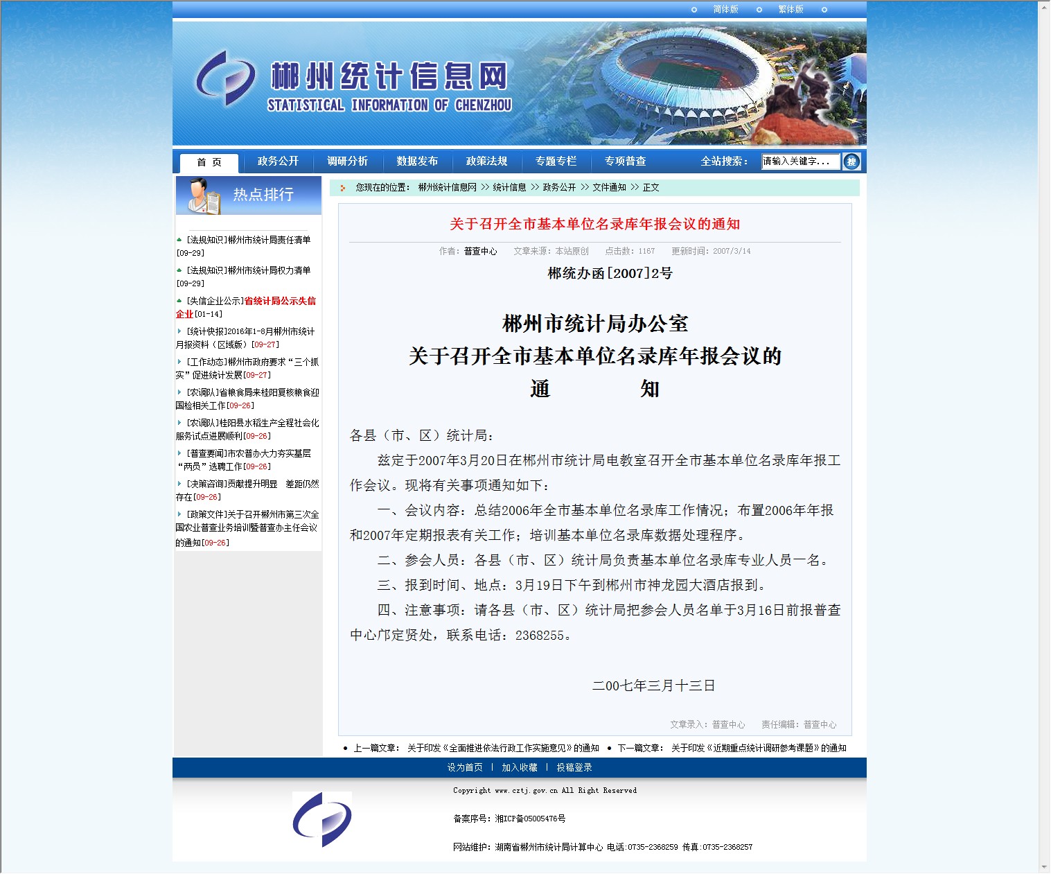 兹定于2007年3月20日在郴州市统计局电教室召开全市基本单位名录库年报工作会议。现将有关事项通知如下:
