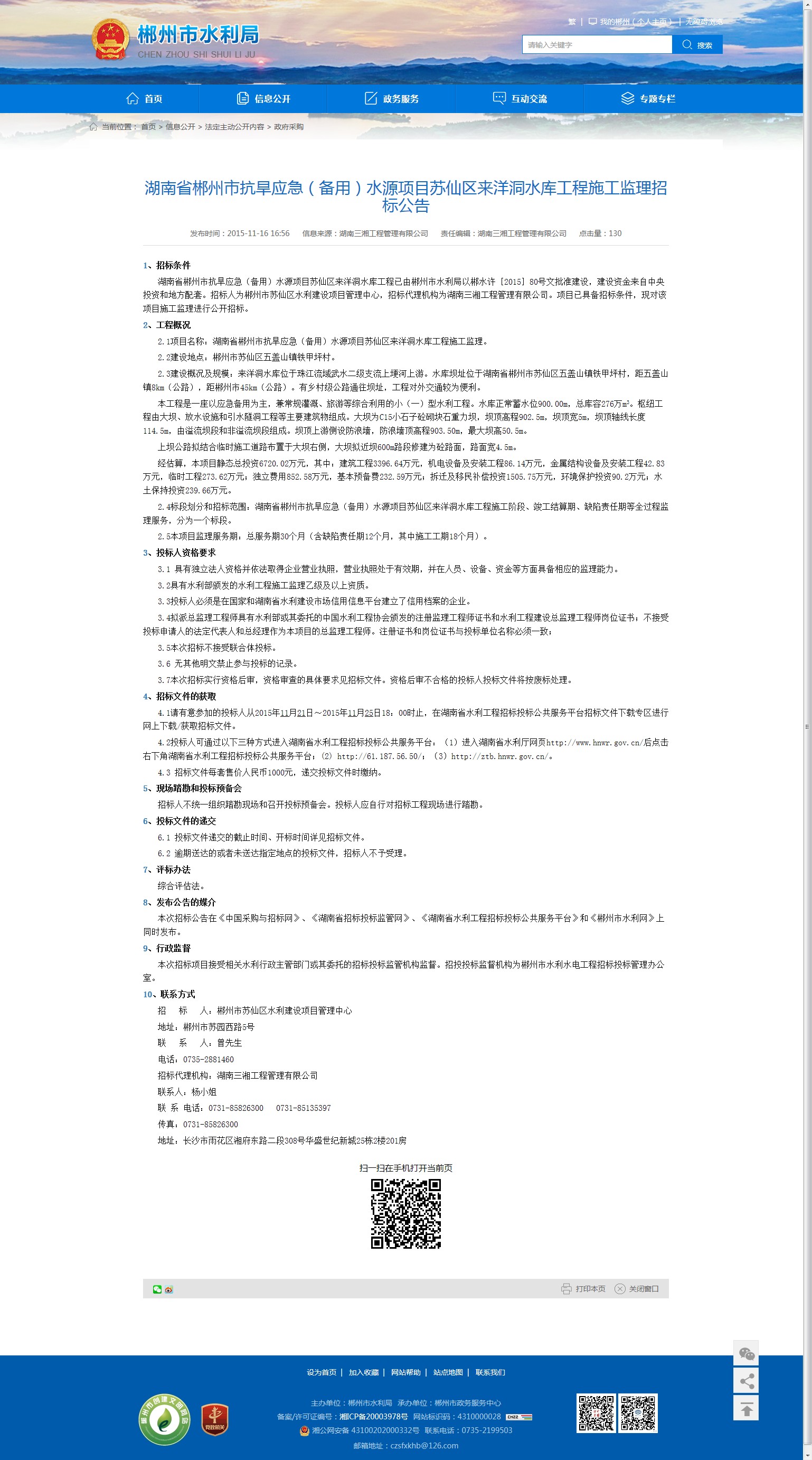 本次招标公告在《中国采购与招标网》、《湖南省招标投标监管网》、《湖南省水利工程招标投标公共服务平台》和《郴州市水利网》上同时发布。