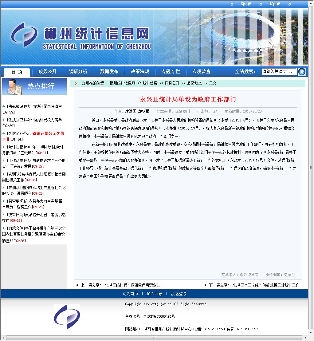 近日,永兴县委、县政府联合下发了《关于永兴县人民政府机构设置的通知》(永委〔2015〕4号)、《关于印发<永兴县人民政府职能转变和机构改革方案的实施意见>的通知》(永办发〔2015〕23号),标志着永兴县新一轮政府机构改革阶段性完成。根据文件精神,永兴县统计局继续单设且成为24个政府工作部门之一。