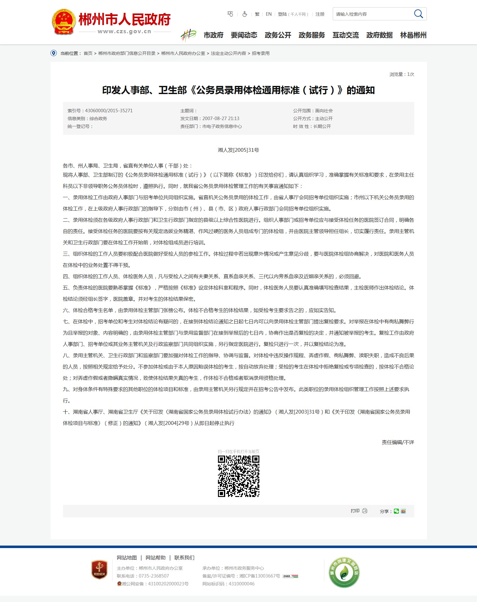 十、湖南省人事厅、湖南省卫生厅《关于印发〈湖南省国家公务员录用体检试行办法〉的通知》(湘人发[2003]31号)和《关于印发〈湖南省国家公务员录用体检项目与标准〉(修正)的通知》(湘人发[2004]29号)从即日起停止执行