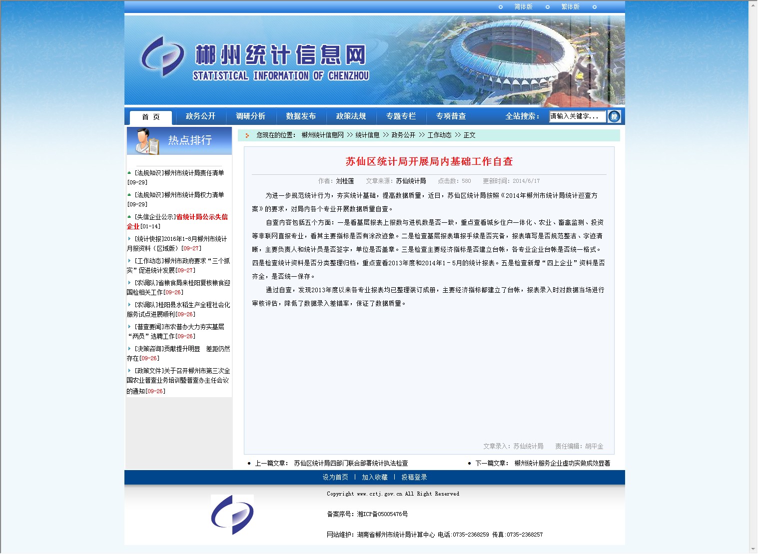 为进一步规范统计行为,夯实统计基础,提高数据质量,近日,苏仙区统计局按照《2014年郴州市统计局统计巡查方案》的要求,对局内各个专业开展数据质量自查。
