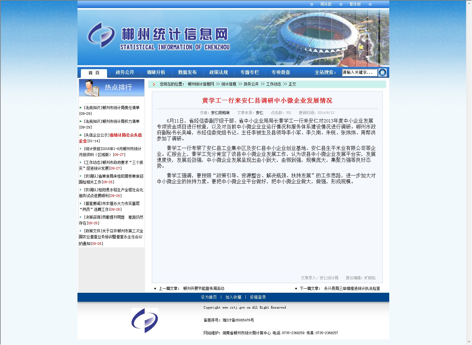6月11日,省经信委副厅级干部、省中小企业局局长黄学工一行来安仁对2013年度中小企业发展专项资金项目进行核查,以及对当前中小微企业业运行情况和服务体系建设情况进行调研。郴州市政府副秘书长吴峰,市经信委党组书记、主任李被生及县领导李小军、李久南、朱锐、张炜炜、周帮洪参加了调研。