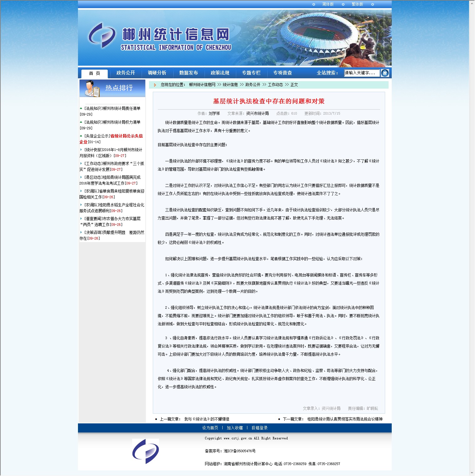 4、强化部门配合,提高统计执法的权威性。统计部门要积极主动争取人大、政协和纪检、监察、司法等部门的大力支持与配合,依照《统计法》等国家法律法规和党纪、政纪有关规定,扎实抓好统计弄虚作假案件的查处工作,不断增强统计执法的科学化、公正化,进一步提高统计执法的权威性。