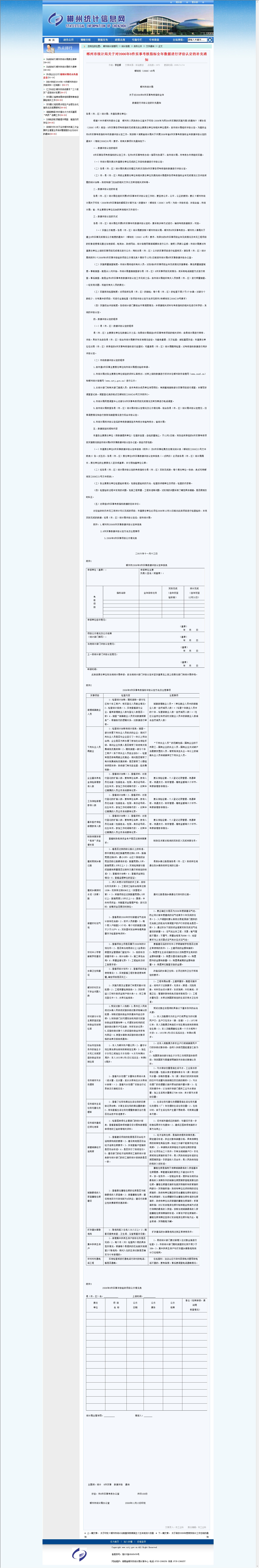 根据《中共郴州市委办公室 郴州市人民政府办公室关于印发<2006年为民办8件实事的实施方案>的通知》(郴办发〔2006〕5号)规定,8件实事各项考核指标完成情况由主要责任单位和相关单位提供,由市统计局组织评估认定。为搞好全市8件实事考核指标年终数据评估认定工作,现按照《湖南省统计局关于开展2006年省8件实事考核指标全年数据评估认定的通知》(湘统[2006]91号)要求,将有关事项补充通知如下: