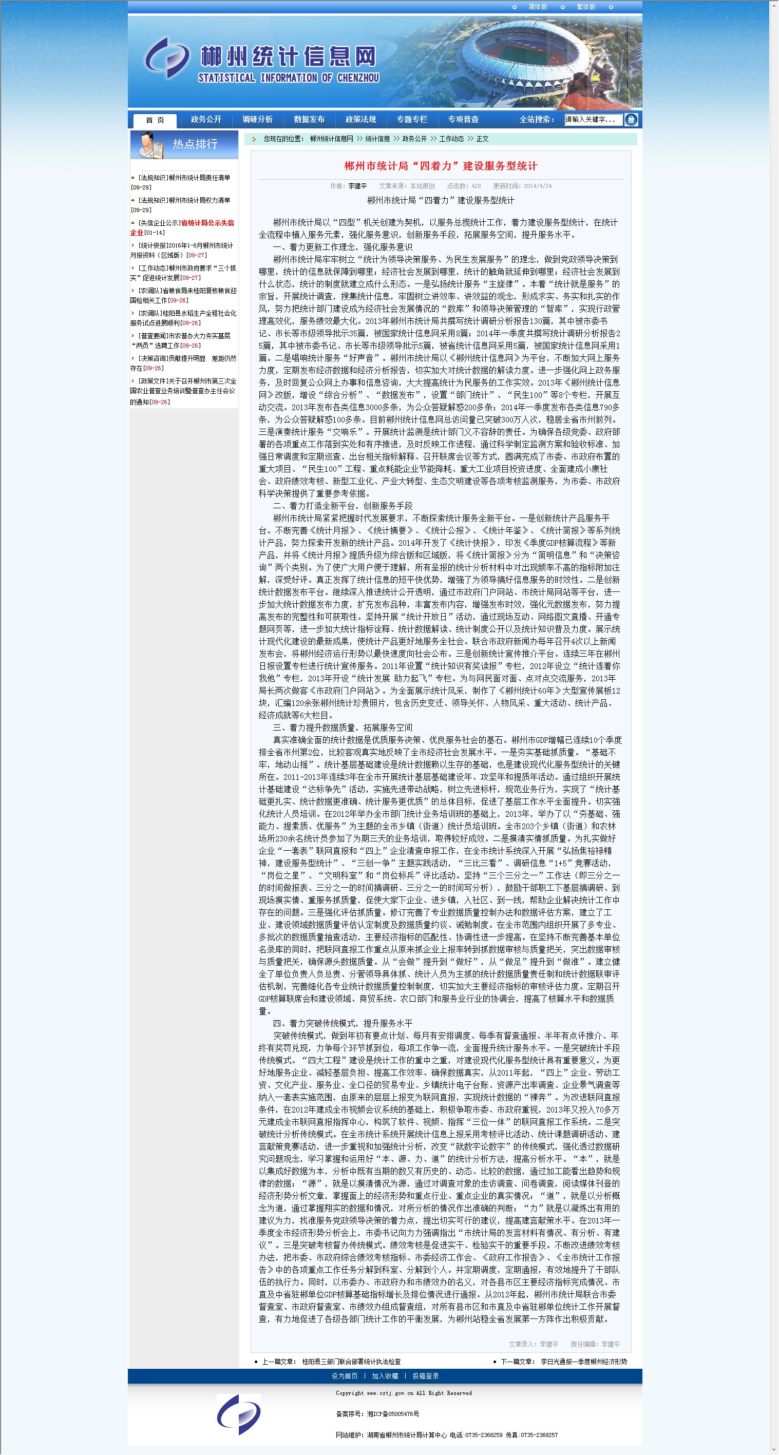 郴州市统计局以“四型”机关创建为契机,以服务总揽统计工作,着力建设服务型统计,在统计全流程中植入服务元素,强化服务意识,创新服务手段,拓展服务空间,提升服务水平。