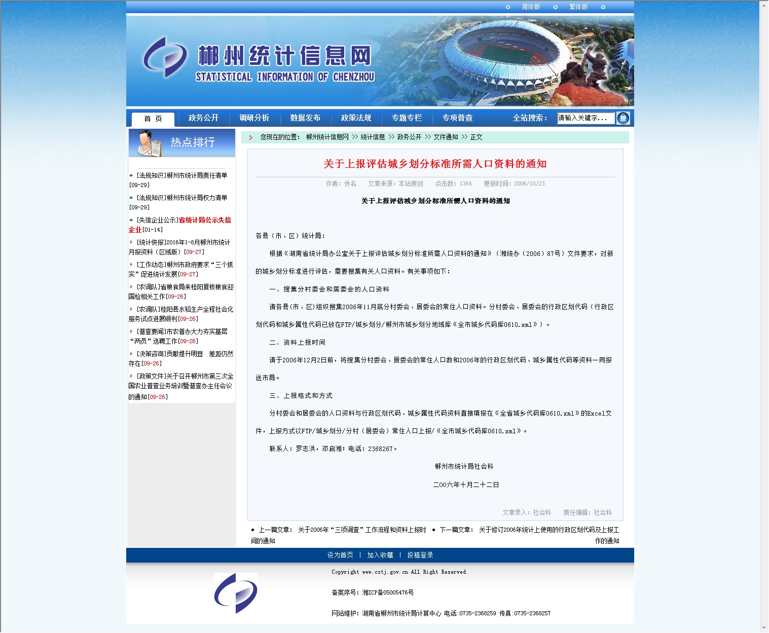 根据《湖南省统计局办公室关于上报评估城乡划分标准所需人口资料的通知》(湘统办〔2006〕87号)文件要求,对新的城乡划分标准进行评估,需要搜集有关人口资料。有关事项如下: