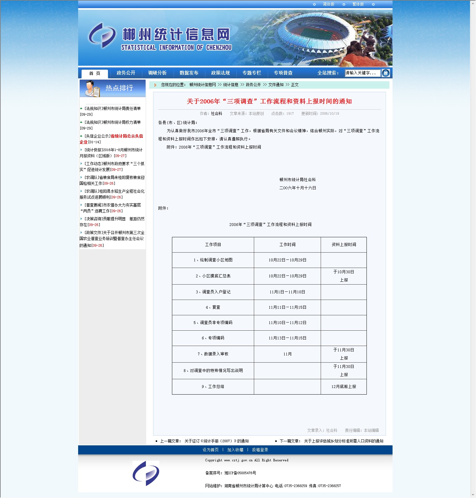 为认真做好我市2006年全市“三项调查”工作,根据省局有关文件和会议精神,结合郴州实际,对“三项调查”工作流程和资料上报时间作出如下安排,请认真遵照执行。