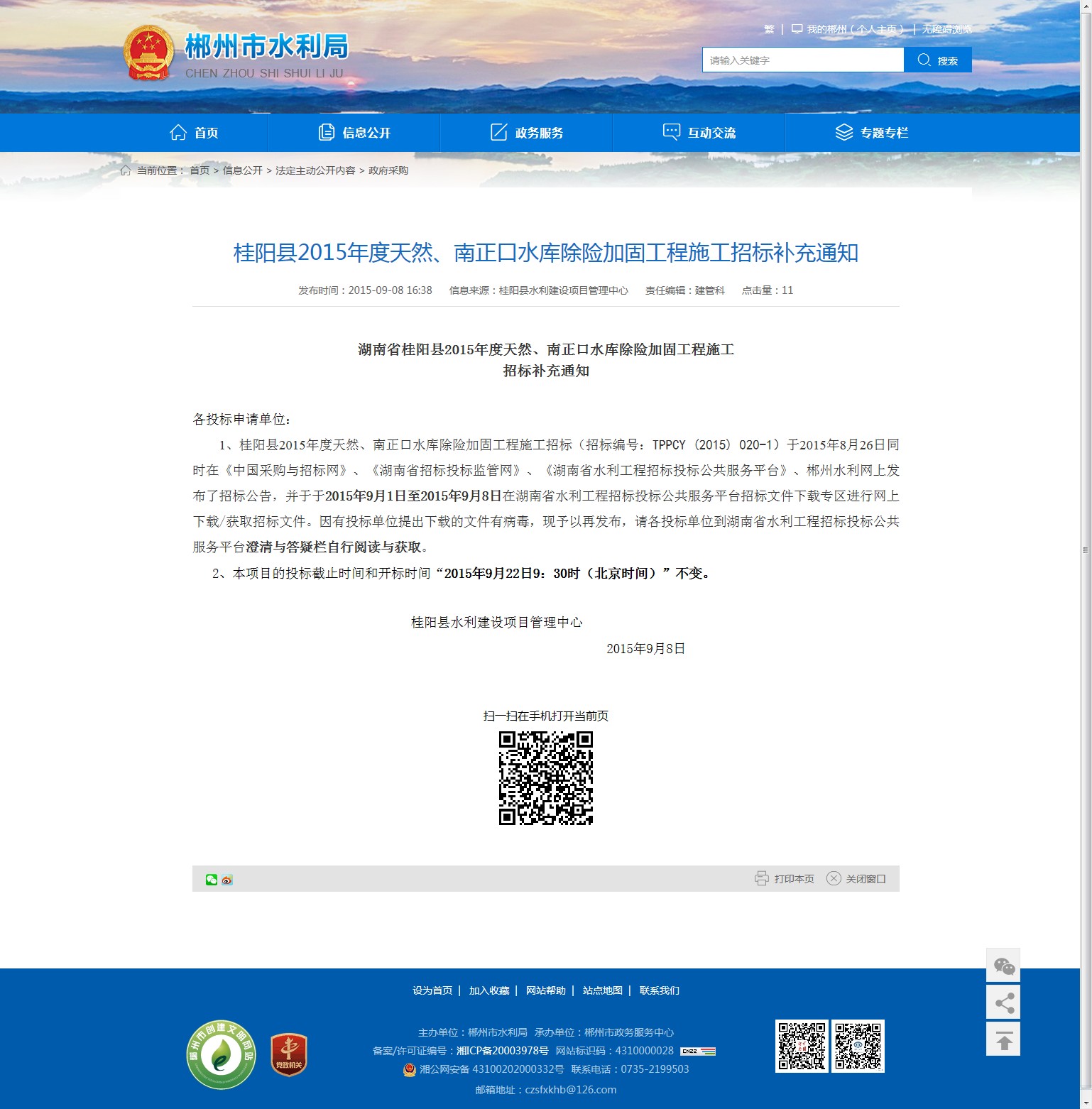 1、桂阳县2015年度天然、南正口水库除险加固工程施工招标(招标编号:TPPCY (2015) 020-1)于2015年8月26日同时在《中国采购与招标网》、《湖南省招标投标监管网》、《湖南省水利工程招标投标公共服务平台》、郴州水利网上发布了招标公告,并于于2015年9月1日至2015年9月8日在湖南省水利工程招标投标公共服务平台招标文件下载专区进行网上下载/获取招标文件。因有投标单位提出下载的文件有病毒,现予以再发布,请各投标单位到湖南省水利工程招标投标公共服务平台澄清与答疑栏自行阅读与获取。