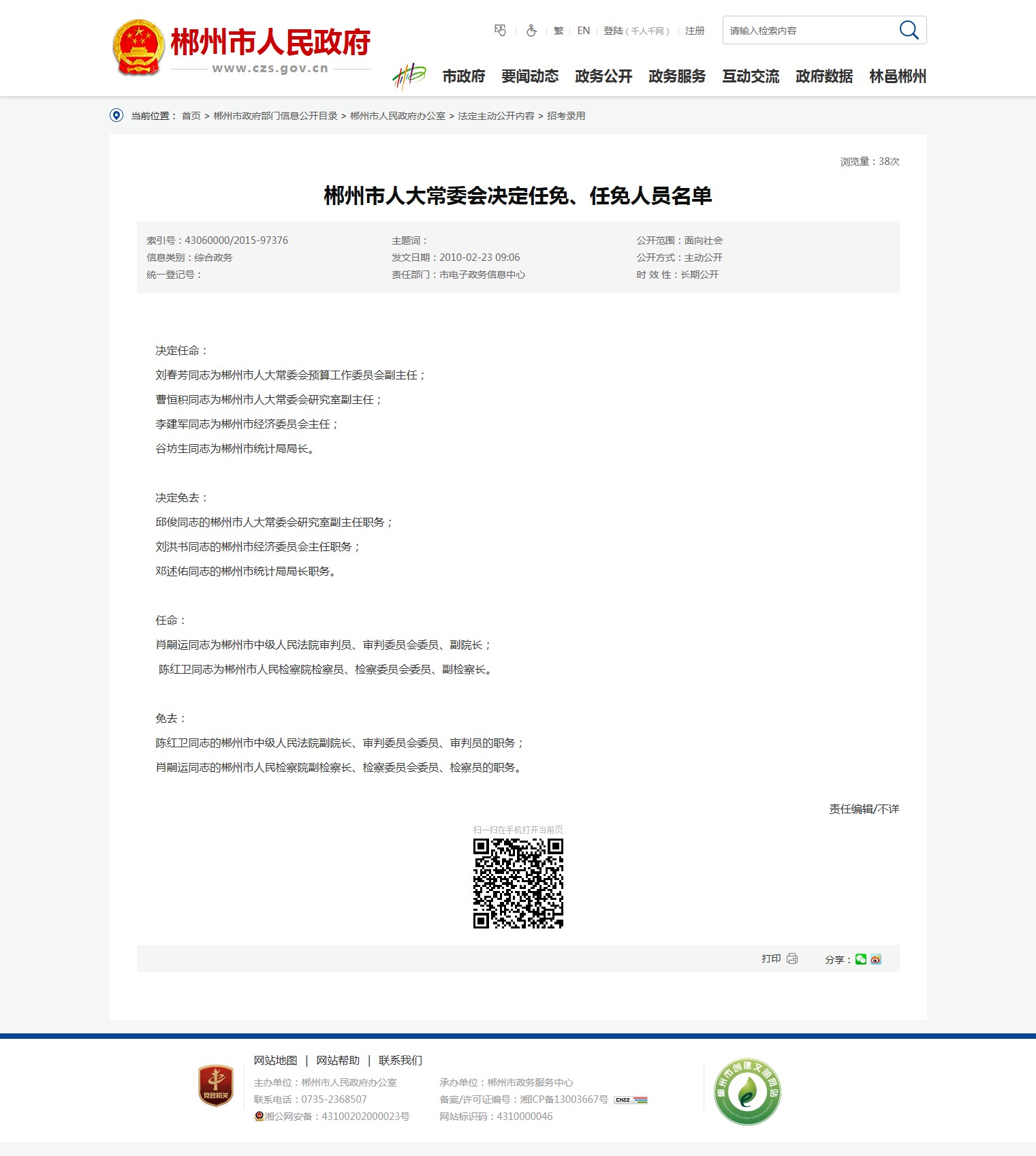 刘春芳同志为郴州市人大常委会预算工作委员会副主任;