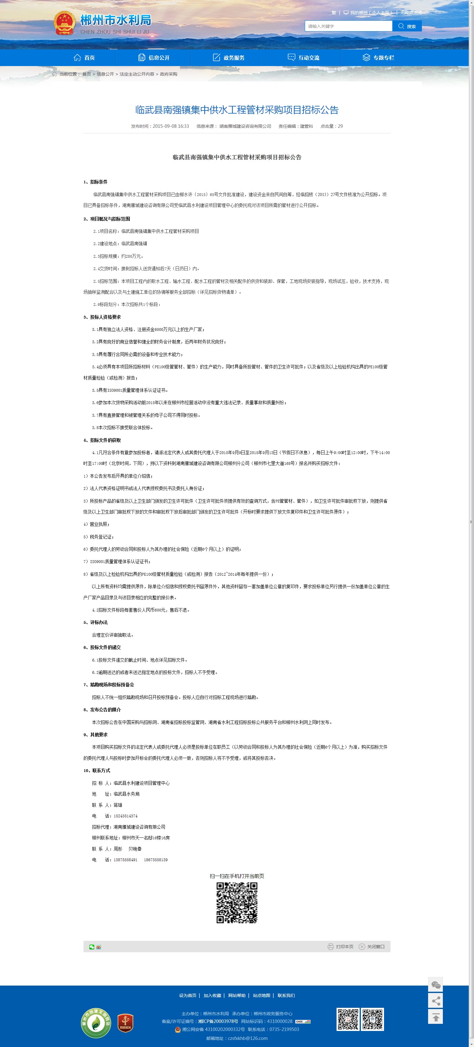 临武县南强镇集中供水工程管材采购项目已由郴水许〔2015〕65号文件批准建设,建设资金来自民间自筹,经临招核(2015)27号文件核准为公开招标。项目已具备招标条件,湖南雁城建设咨询有限公司受临武县水利建设项目管理中心的委托现对该项目所需的管材进行公开招标。