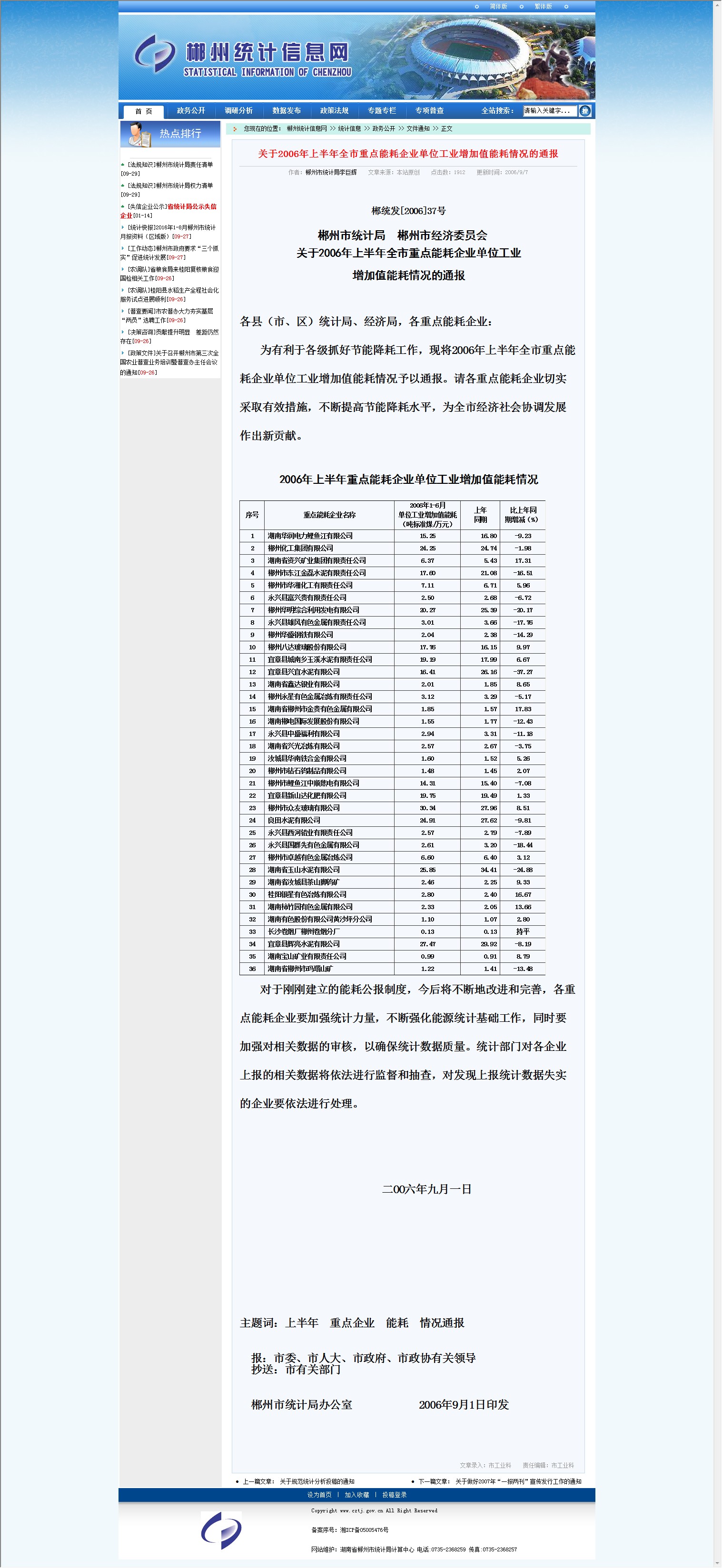 为有利于各级抓好节能降耗工作,现将2006年上半年全市重点能耗企业单位工业增加值能耗情况予以通报。请各重点能耗企业切实采取有效措施,不断提高节能降耗水平,为全市经济社会协调发展作出新贡献。