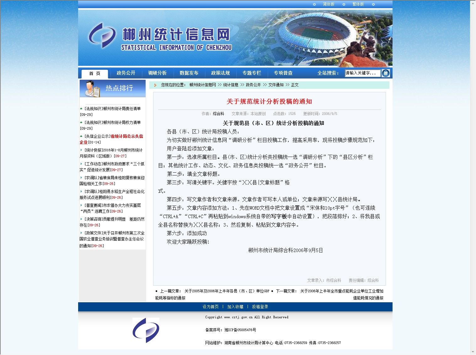 为切实做好郴州统计信息网“调研分析”栏目投稿工作,提高采用率,现将投稿步骤规范如下: