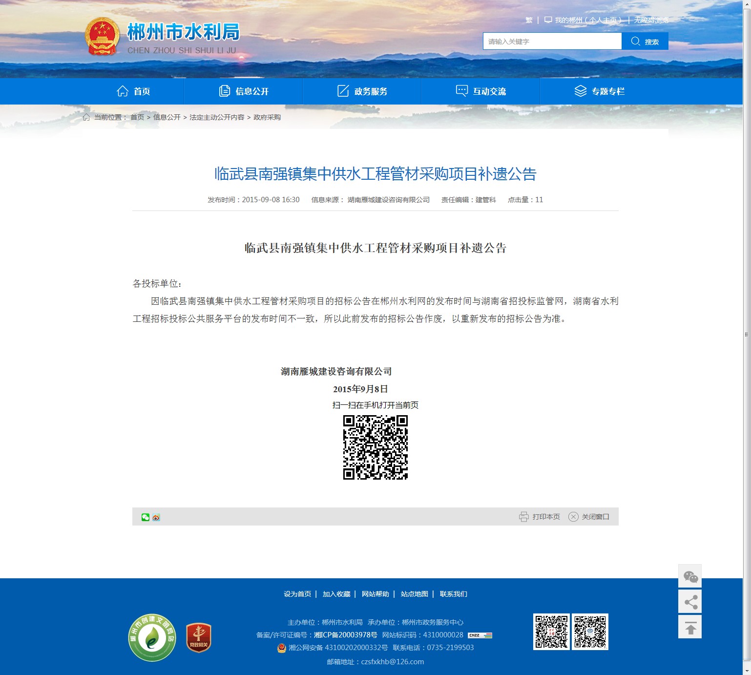 临武县南强镇集中供水工程管材采购项目补遗公告