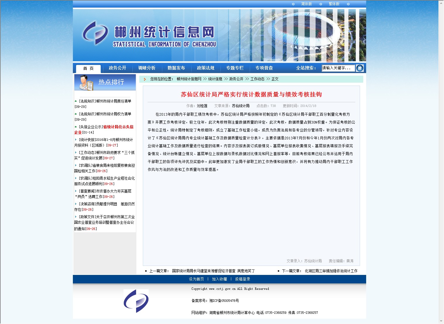 在2013年的局内干部职工绩效考核中,苏仙区统计局严格按照年初制定的《苏仙区统计局干部职工百分制量化考核方案》开展工作考核评定,较之往年,此次考核特别注重数据质量的评定,此次考核,数据质量占到30%权重。为保证考核的公平和公正性,统计局特制定了考核细则,成立了基础工作检查小组,成员为负责法规和各专业的分管领导,针对专业内容设计了《苏仙区统计局局内专业统计基础工作及数据质量检查计分表》,主要依据是2013年7月份和今年1月份两次对局内各专业统计基础工作及数据质量进行检查的结果。内容涉及报表装订成册情况、基层单位报表收集情况、基层报表填报及手续完备情况、统计台帐建立情况、基层单位上报数据与录机数据对比情况和网上直报率等,目前考核结果已经公布并运用于局内干部职工的各项评先评优及奖励中。此举更加激发了全局干部职工的工作热情和创新意识,并将有力推动局内干部职工工作作风与方法的改进和工作质量与效率提高。
