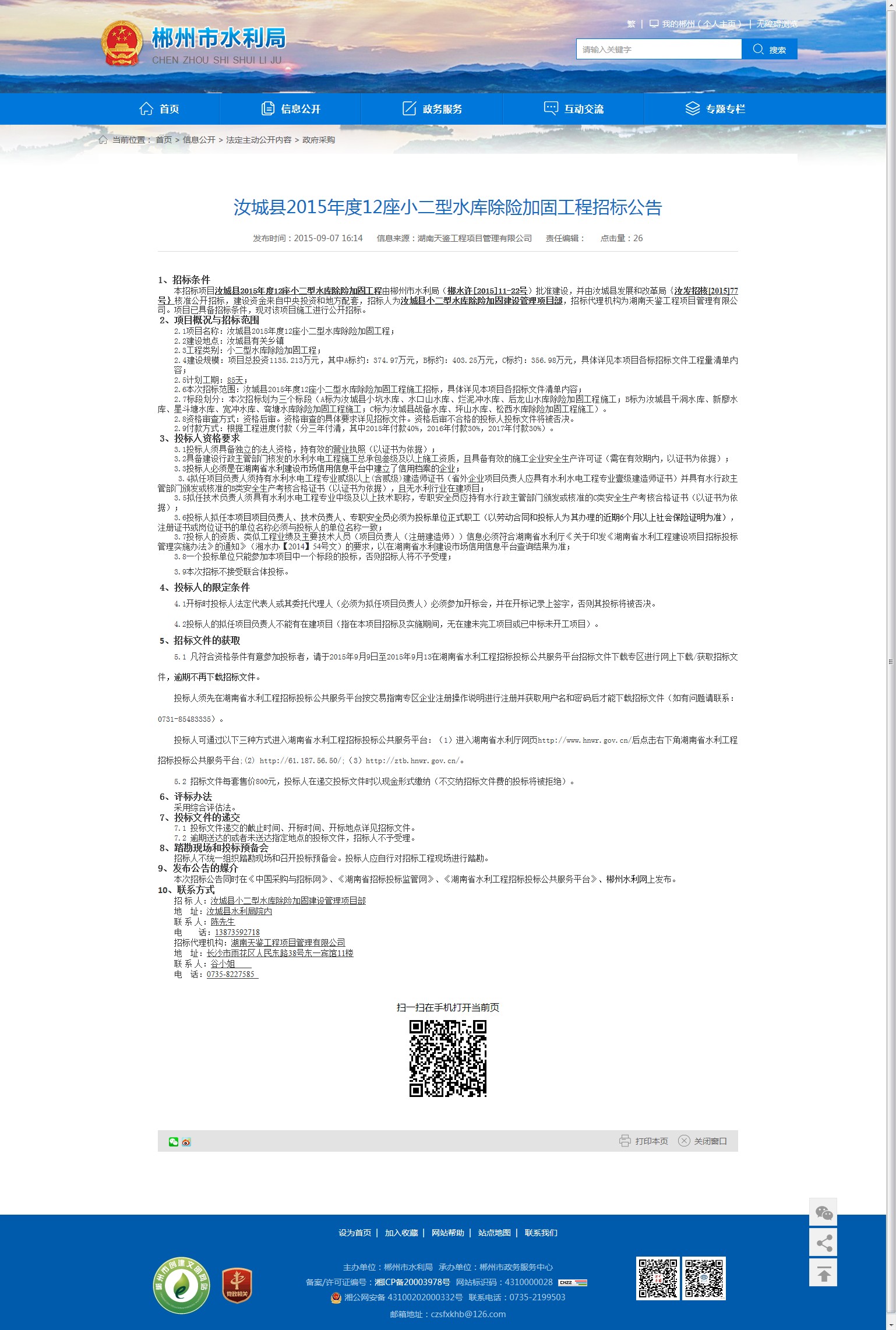 本次招标公告同时在《中国采购与招标网》、《湖南省招标投标监管网》、《湖南省水利工程招标投标公共服务平台》、郴州水利网上发布。
