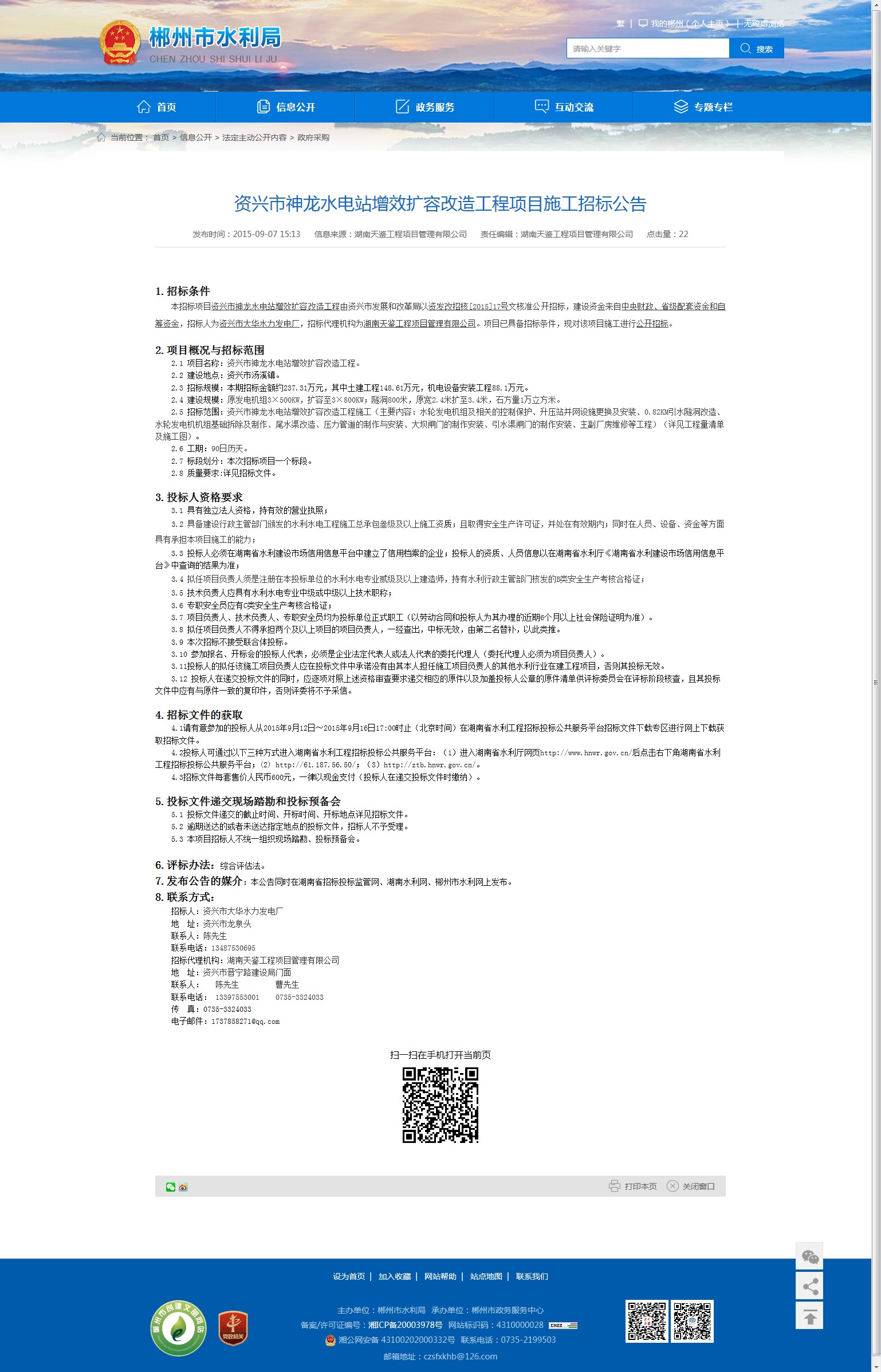 7.发布公告的媒介:本公告同时在湖南省招标投标监管网、湖南水利网、郴州市水利网上发布。