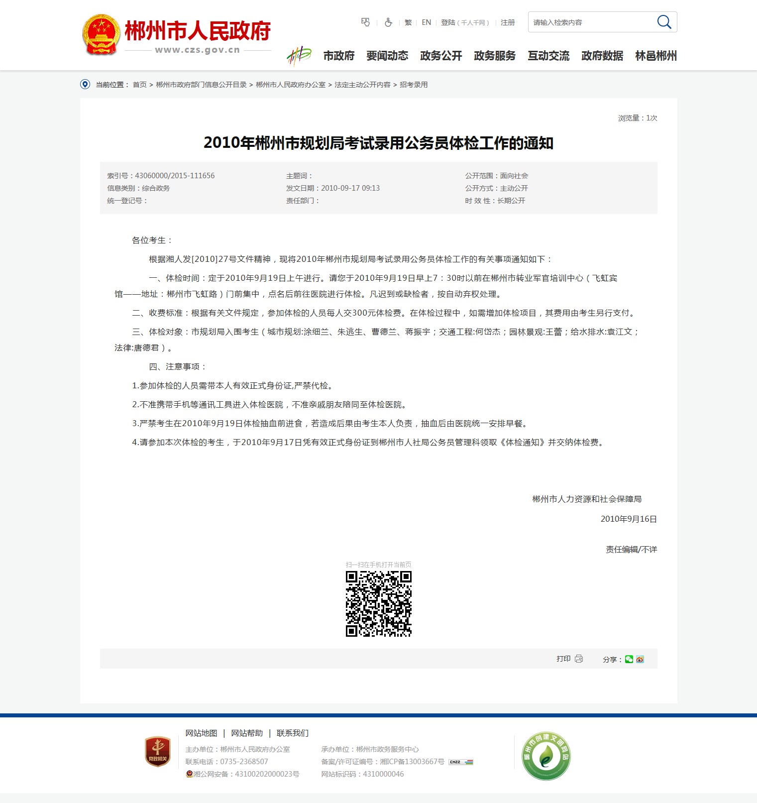 4.请参加本次体检的考生,于2010年9月17日凭有效正式身份证到郴州市人社局公务员管理科领取《体检通知》并交纳体检费。
