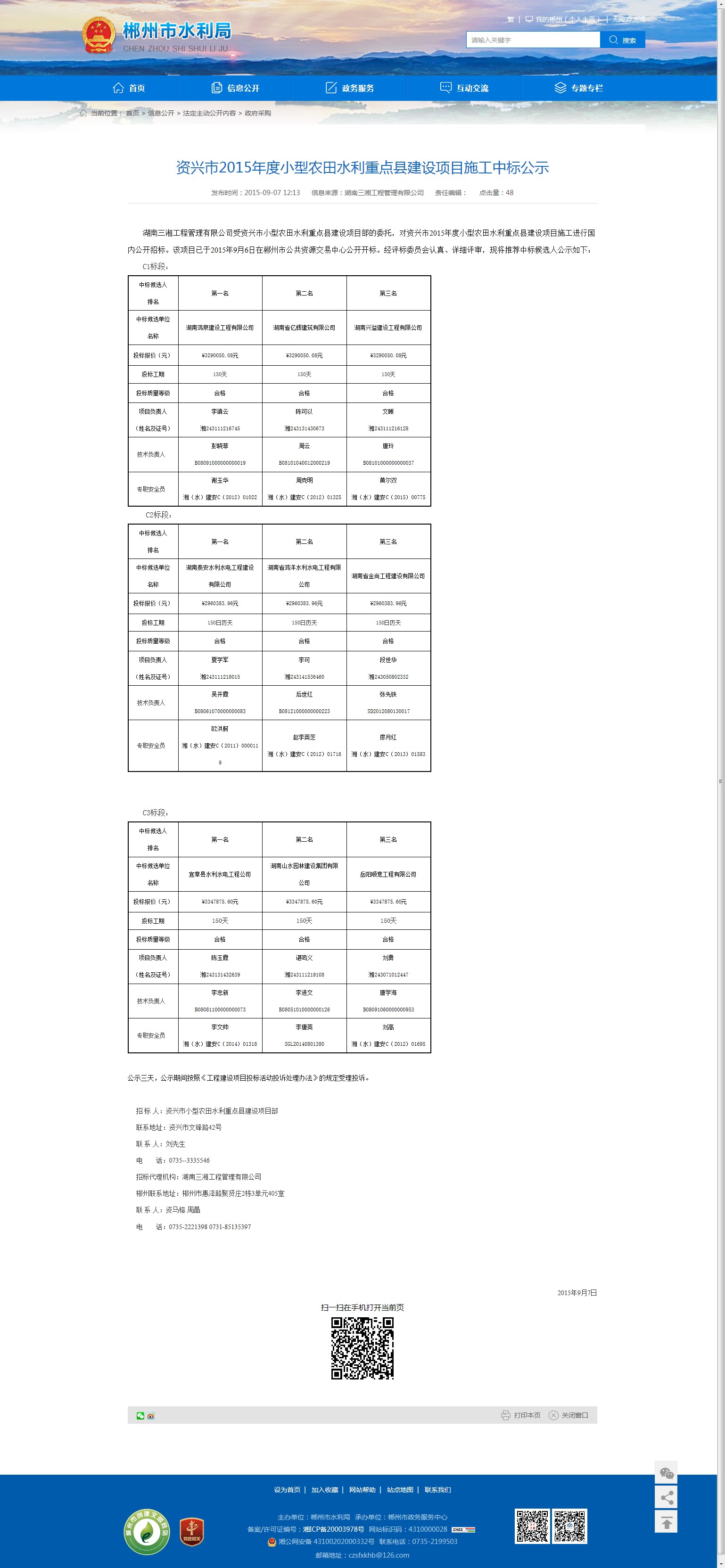湖南三湘工程管理有限公司受资兴市小型农田水利重点县建设项目部的委托,对资兴市2015年度小型农田水利重点县建设项目施工进行国内公开招标。该项目已于2015年9月6日在郴州市公共资源交易中心公开开标。经评标委员会认真、详细评审,现将推荐中标候选人公示如下: