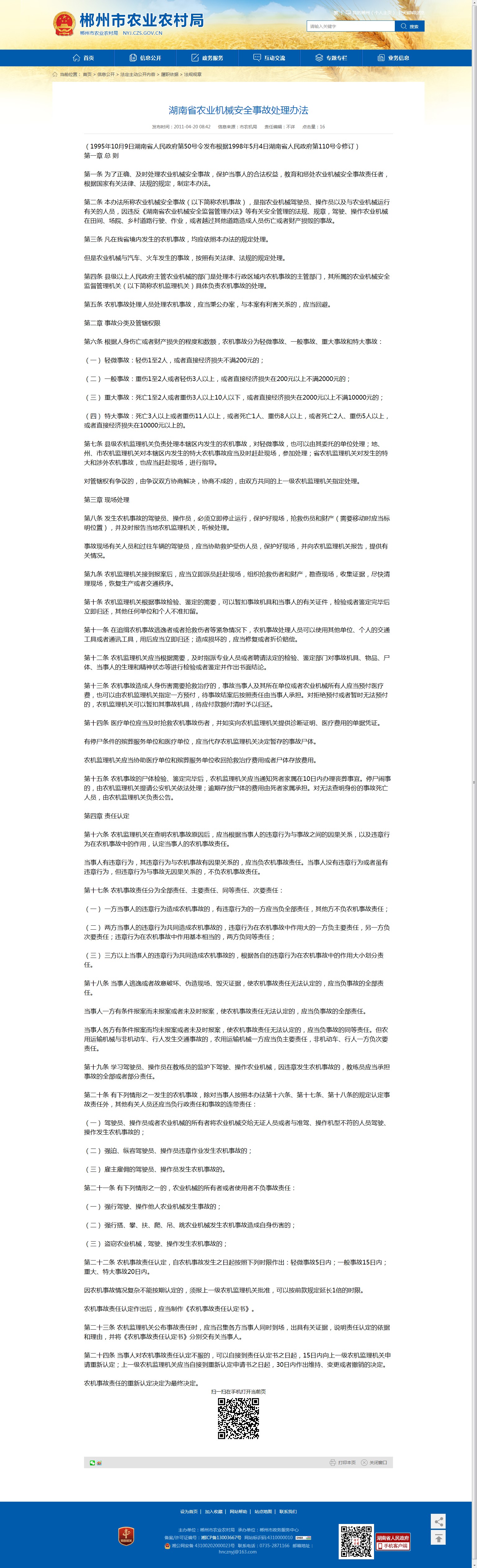 第二条 本办法所称农业机械安全事故(以下简称农机事故),是指农业机械驾驶员、操作员以及与农业机械运行有关的人员,因违反《湖南省农业机械安全监督管理办法》等有关安全管理的法规、规章,驾驶、操作农业机械在田间、场院、乡村道路行驶、作业,或者越过其他道路造成人员伤亡或者财产损毁的事故。