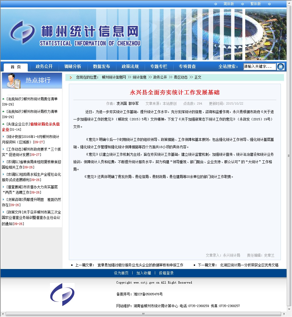 近日,为进一步夯实统计工作基础,提升统计工作水平,充分发挥统计的信息、咨询和监督作用,永兴县根据市政府《关于进一步加强统计工作的意见》(郴政发〔2015〕5号)文件精神,下发了《关于加强新常态下统计工作的意见》(永政发〔2015〕19号)文件。