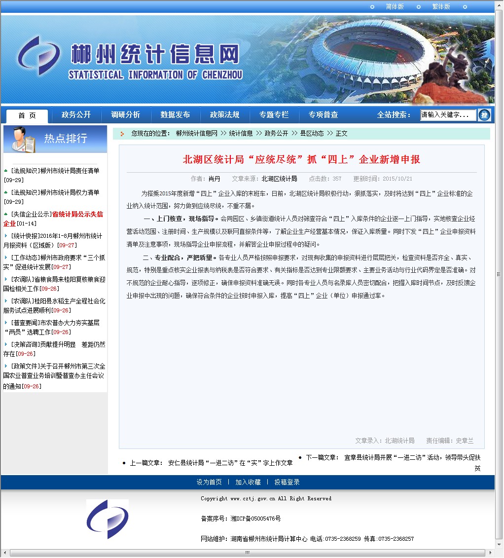 为搭乘2015年度新增“四上”企业入库的末班车,日前,北湖区统计局积极行动,狠抓落实,及时将达到“四上”企业标准的企业纳入统计范围,努力做到应统尽统,不重不漏。