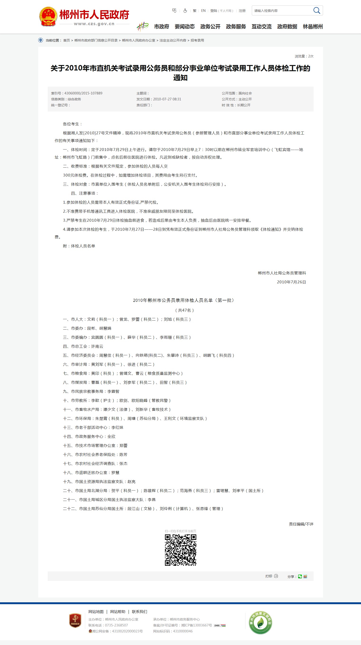 4.请参加本次体检的考生,于2010年7月27日——28日到凭有效正式身份证到郴州市人社局公务员管理科领取《体检通知》并交纳体检费。