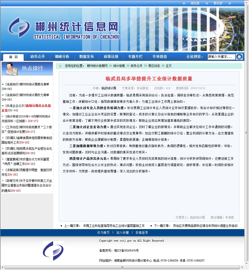 日前,为进一步提升工业统计数据质量,临武县局采用培训会议、执法检查、调研走访等形式,从熟悉核算原理、规范基础工作、讲解统计口径、指导数据填报等多方面入手,力推工业统计工作再上新台阶。