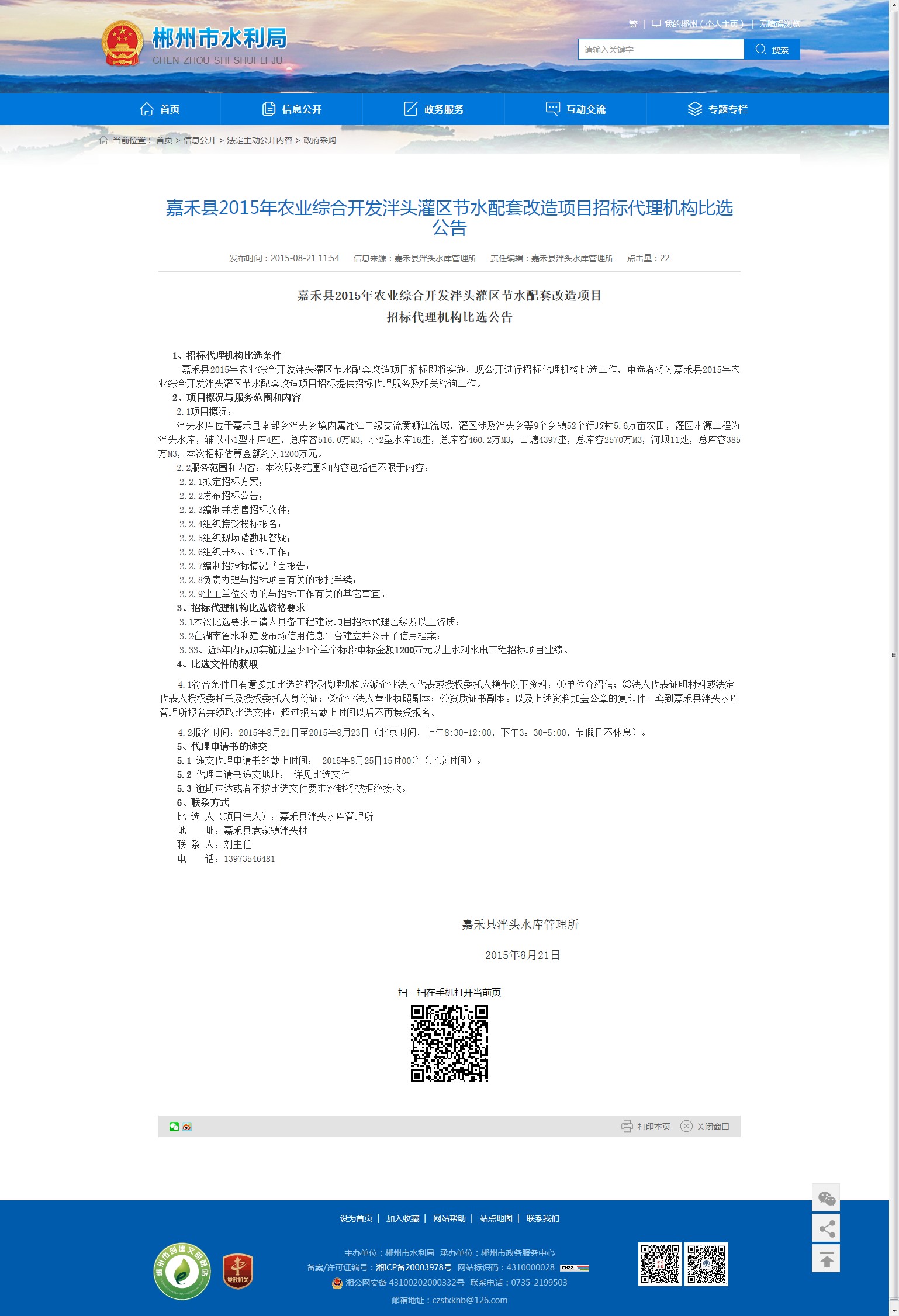 嘉禾县2015年农业综合开发泮头灌区节水配套改造项目招标即将实施,现公开进行招标代理机构比选工作,中选者将为嘉禾县2015年农业综合开发泮头灌区节水配套改造项目招标提供招标代理服务及相关咨询工作。