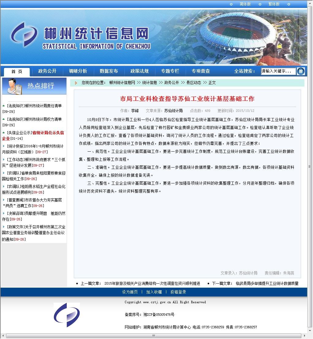 10月9日下午,市统计局工业科一行4人莅临苏仙区检查指导工业统计基层基础工作,苏仙区统计局局长率工业统计专业人员陪同检查组深入到企业基层,先后检查了柿竹园矿和金贵银业两家公司的统计基层基础工作。检查组认真听取了企业统计负责人的工作汇报,查看了各项统计基础资料,询问了统计人员的工作流程。通过检查,检查组肯定了两家公司的统计工作成绩,指出两家公司的统计工作各有特点,数据来源较为翔实,但细节仍需完善,并提出了三点要求: