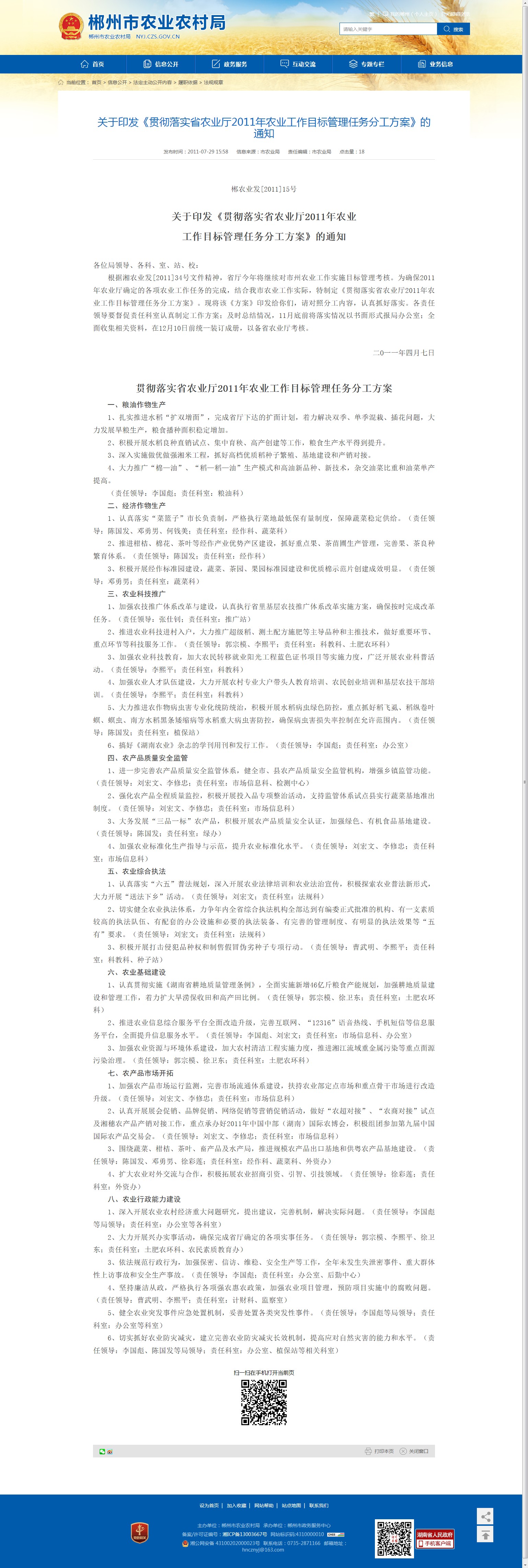 根据湘农业发[2011]34号文件精神,省厅今年将继续对市州农业工作实施目标管理考核。为确保2011年农业厅确定的各项农业工作任务的完成,结合我市农业工作实际,特制定《贯彻落实省农业厅2011年农业工作目标管理任务分工方案》。现将该《方案》印发给你们,请对照分工内容,认真抓好落实。各责任领导要督促责任科室认真制定工作方案;及时总结情况,11月底前将落实情况以书面形式报局办公室;全面收集相关资料,在12月10日前统一装订成册,以备省农业厅考核。