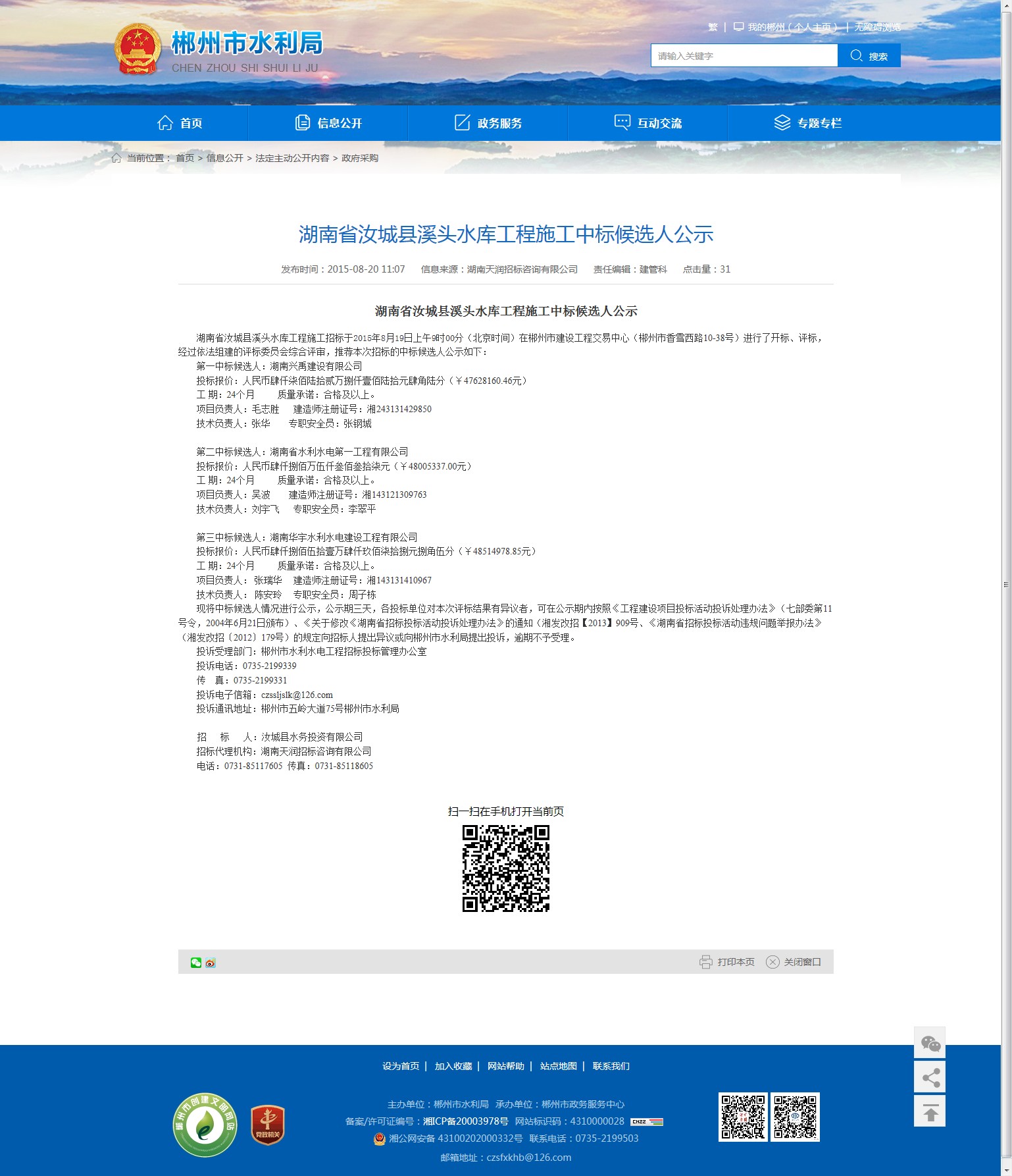 现将中标候选人情况进行公示,公示期三天,各投标单位对本次评标结果有异议者,可在公示期内按照《工程建设项目投标活动投诉处理办法》(七部委第11号令,2004年6月21日颁布)、《关于修改《湖南省招标投标活动投诉处理办法》的通知(湘发改招【2013】909号、《湖南省招标投标活动违规问题举报办法》(湘发改招〔2012〕179号)的规定向招标人提出异议或向郴州市水利局提出投诉,逾期不予受理。