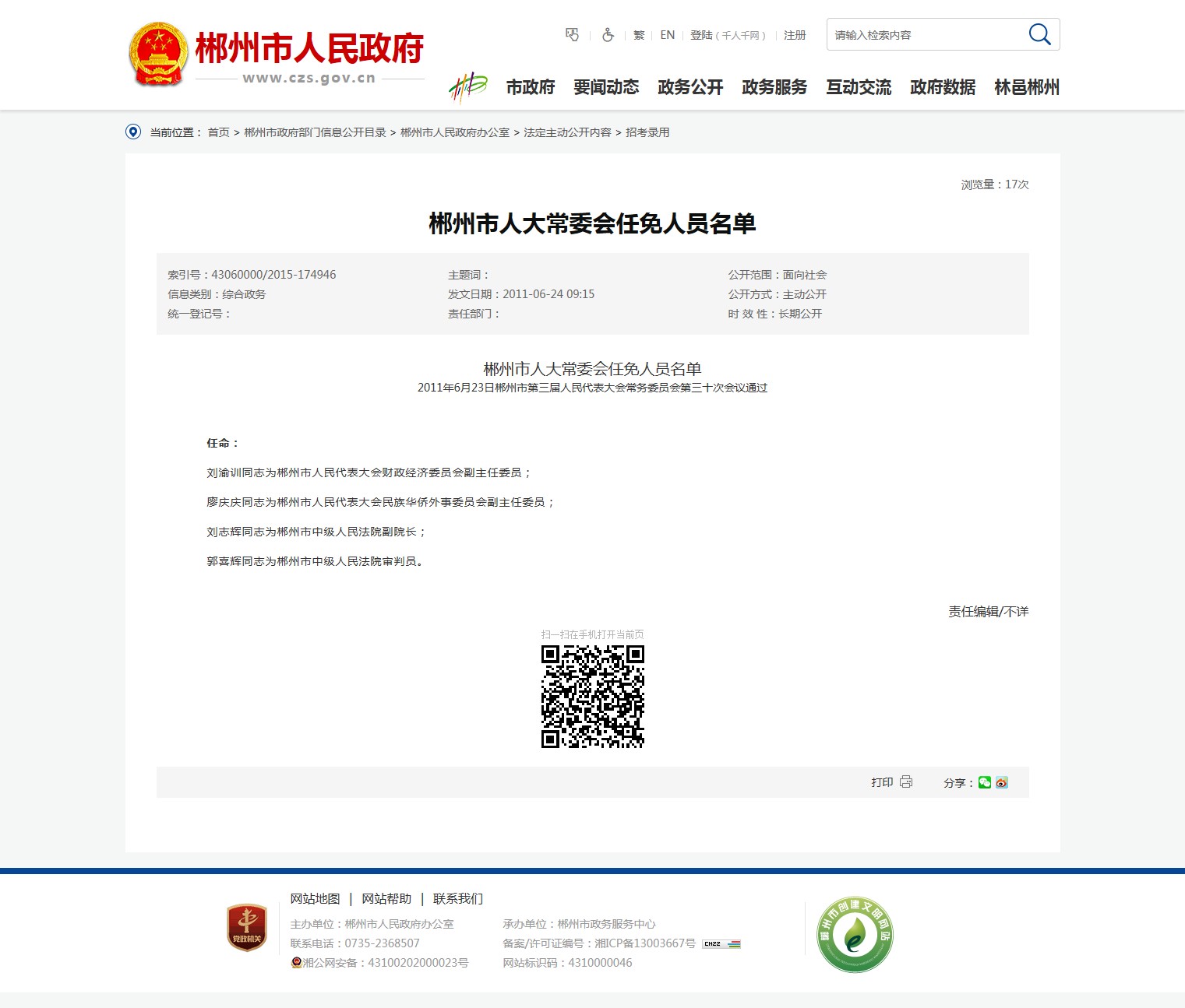 郭喜辉同志为郴州市中级人民法院审判员。