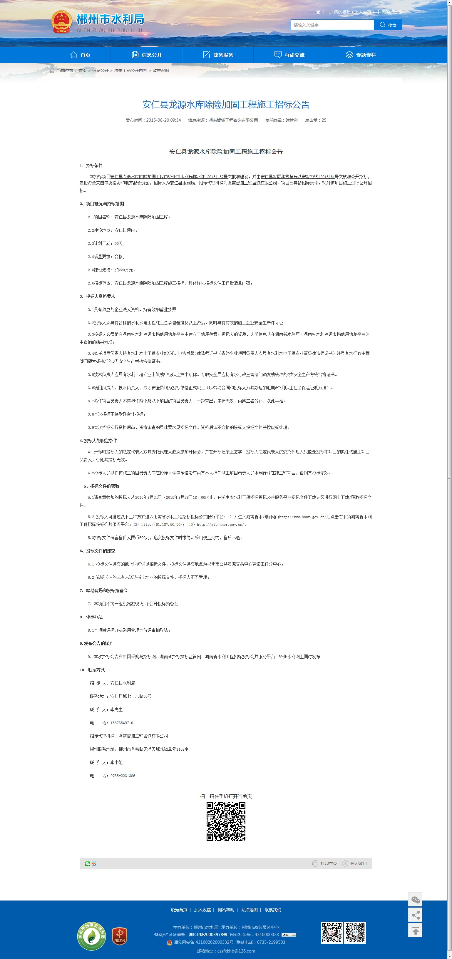 本招标项目安仁县龙源水库除险加固工程由郴州市水利局郴水许[2015] 57号文批准建设,并由安仁县发展和改革局以安发招核[2015]61号文核准公开招标,建设资金来自中央投资和地方配套资金,招标人为安仁县水利局,招标代理机构为湖南智埔工程咨询有限公司。项目已具备招标条件,现对该项目施工进行公开招标。