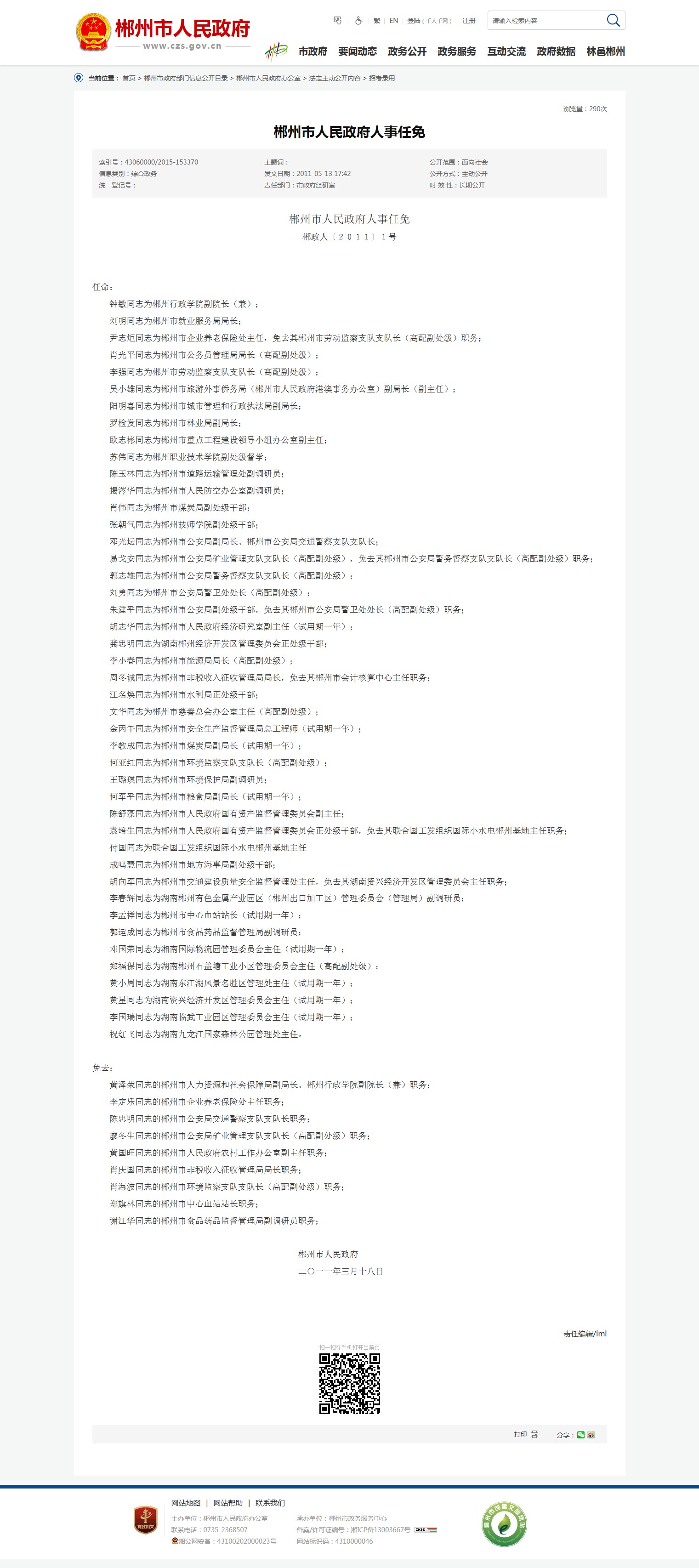 郭运成同志为郴州市食品药品监督管理局副调研员;