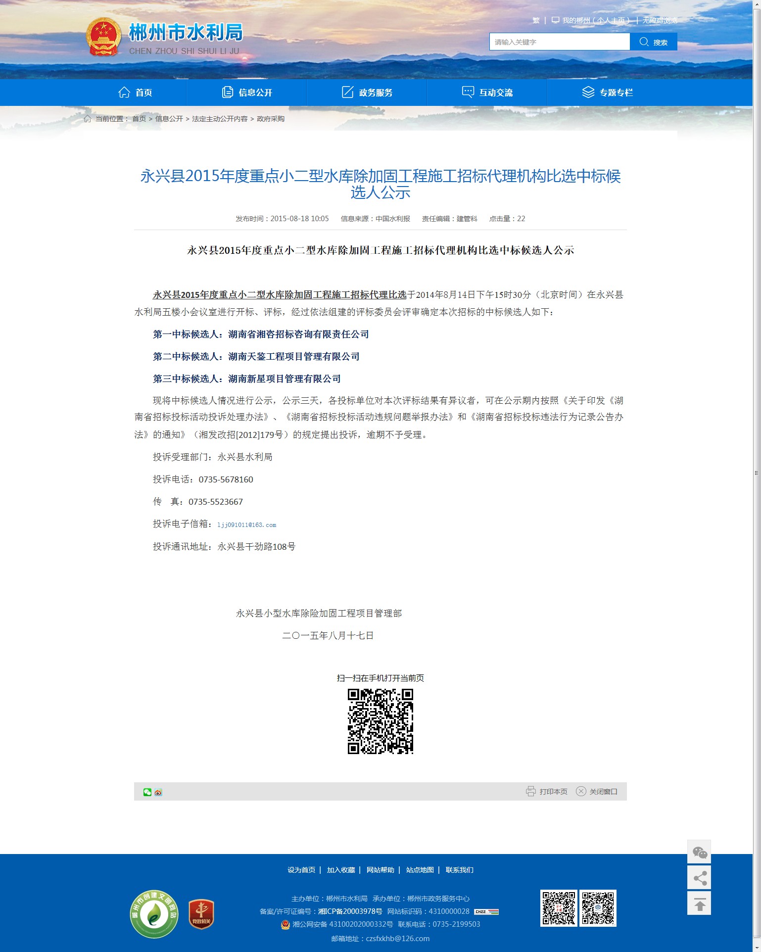永兴县2015年度重点小二型水库除加固工程施工招标代理机构比选中标候选人公示