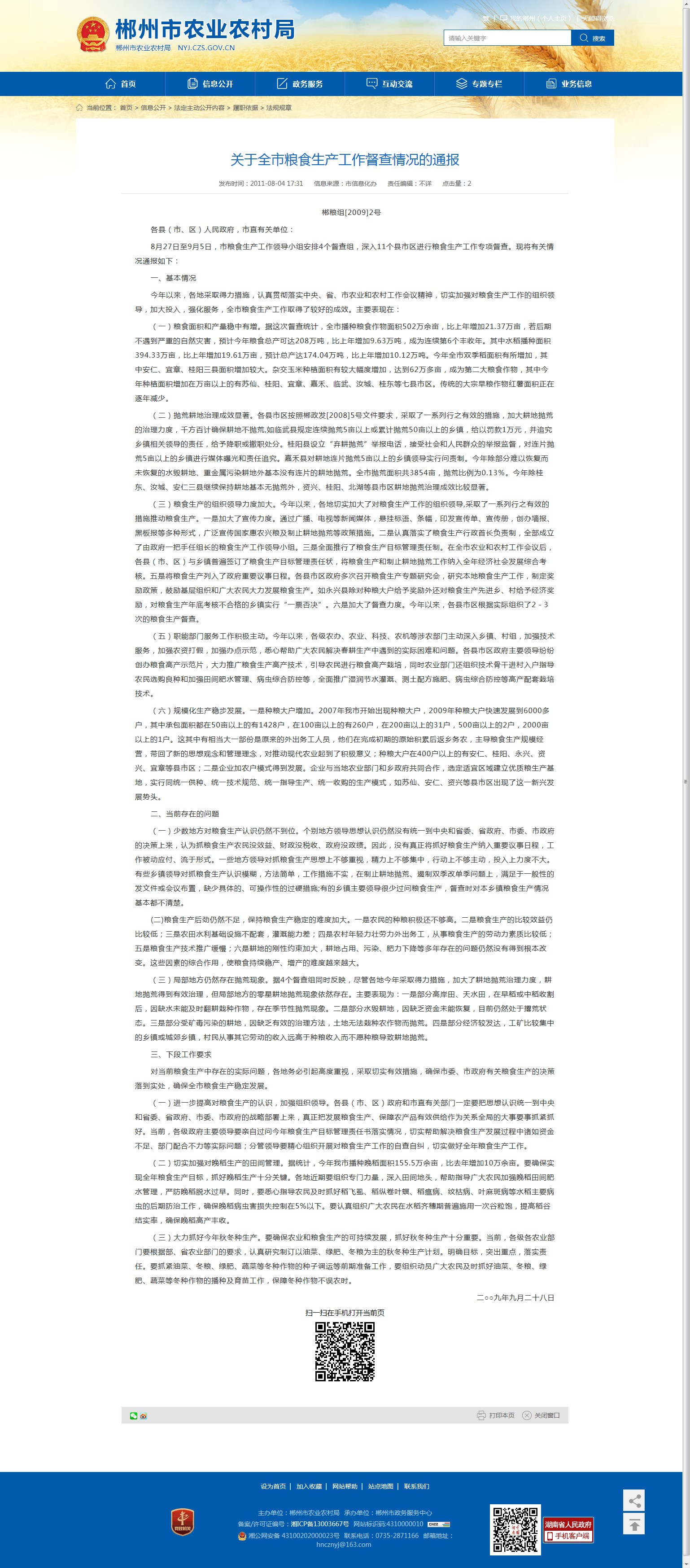 (三)粮食生产的组织领导力度加大。今年以来,各地切实加大了对粮食生产工作的组织领导,采取了一系列行之有效的措施推动粮食生产。一是加大了宣传力度。通过广播、电视等新闻媒体,悬挂标语、条幅,印发宣传单、宣传册,创办墙报、黑板报等多种形式,广泛宣传国家惠农兴粮及制止耕地抛荒等政策措施。二是认真落实了粮食生产行政首长负责制,全部成立了由政府一把手任组长的粮食生产工作领导小组。三是全面推行了粮食生产目标管理责任制。在全市农业和农村工作会议后,各县(市、区)与乡镇普遍签订了粮食生产目标管理责任状,将粮食生产和制止耕地抛荒工作纳入全年经济社会发展综合考核。五是将粮食生产列入了政府重要议事日程。各县市区政府多次召开粮食生产专题研究会,研究本地粮食生产工作,制定奖励政策,鼓励基层组织和广大农民大力发展粮食生产。如永兴县除对种粮大户给予奖励外还对粮食生产先进乡、村给予经济奖励,对粮食生产年底考核不合格的乡镇实行“一票否决”。六是加大了督查力度。今年以来,各县市区根据实际组织了2-3次的粮食生产督查。