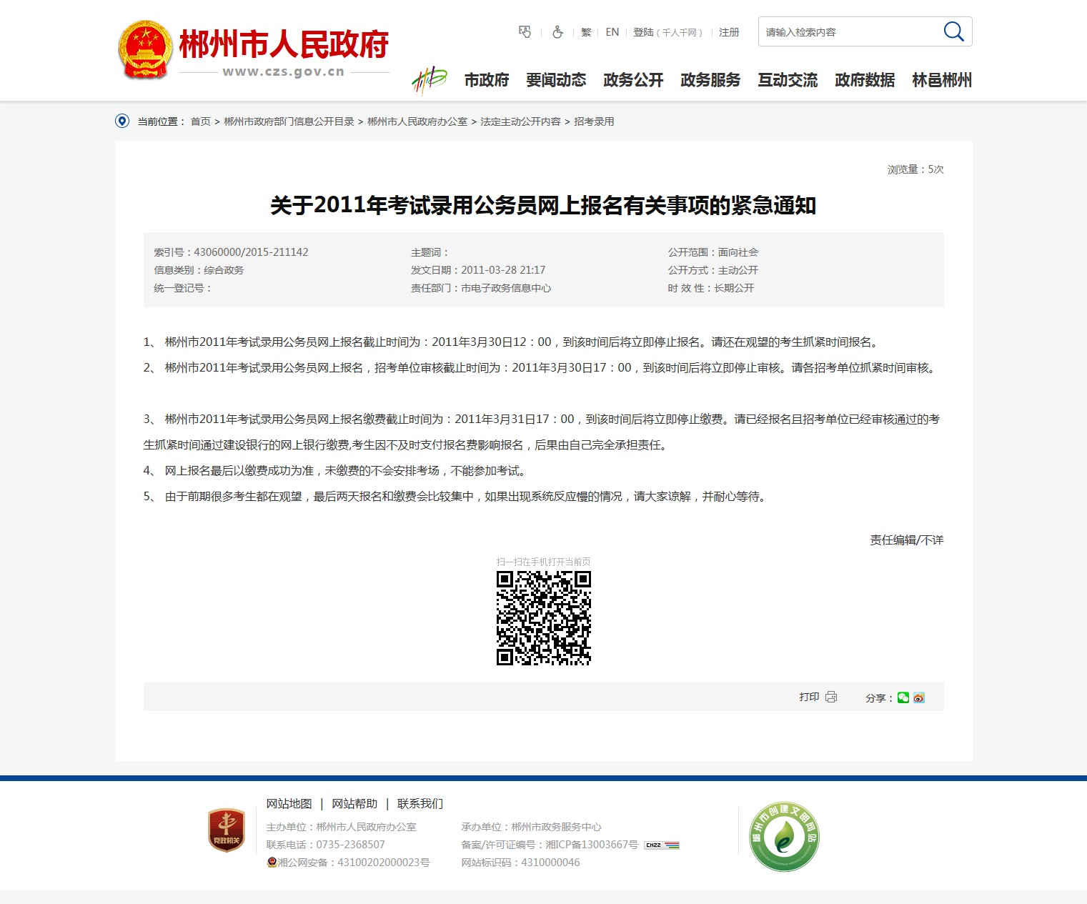 2、 郴州市2011年考试录用公务员网上报名,招考单位审核截止时间为:2011年3月30日17:00,到该时间后将立即停止审核。请各招考单位抓紧时间审核。