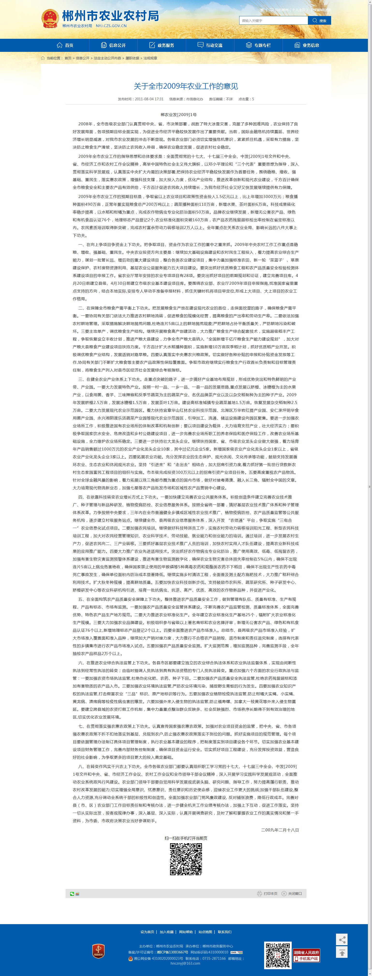 2009年全市农业工作的预期目标是,争取省以上农业项目和政策性资金投入1.5亿元以上,比上年增加3000万元;粮食播种面积490万亩,正常年景实现粮食总产200万吨以上;蔬菜播种面积110万亩,新增水果、茶叶面积6万亩。科技成果转化率稳步提高,以水稻和柑橘为重点,完成农作物病虫专业化防治面积50万亩。品牌农业继续发展,新增无公害农产品、绿色和有机食品认证76个,地理标志产品登记2个,农业标准化面积突破160万亩,农产品农药残留超标检出率控制在省定标准以内。农民素质培训取得新突破,完成农村富余劳动力转移培训2万人以上。全年重点在关系农业全局、影响长远的八件大事上下功夫。