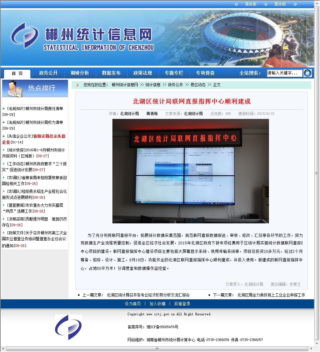 为了充分利用联网直报平台,拓展统计数据采集范围,规范联网直报数据报送、审核、修改、汇总等各环节的工作,努力实现数据生产全流程质量控制,促进全区经济社会发展,2015年北湖区政府下拔专项经费用于区统计局实施统计数据联网直报指挥中心项目的建设。联网直报指挥中心建设项目主要包括大屏幕显示系统、视频传输系统等,项目总投资20多万元,经过2个月的筹备、招标、设计、施工,9月18日,功能齐全的北湖区联网直报指挥中心顺利建成,并投入使用。新建成的联网直报指挥中心,占地50平方米;分调度室和数据操作监控室。