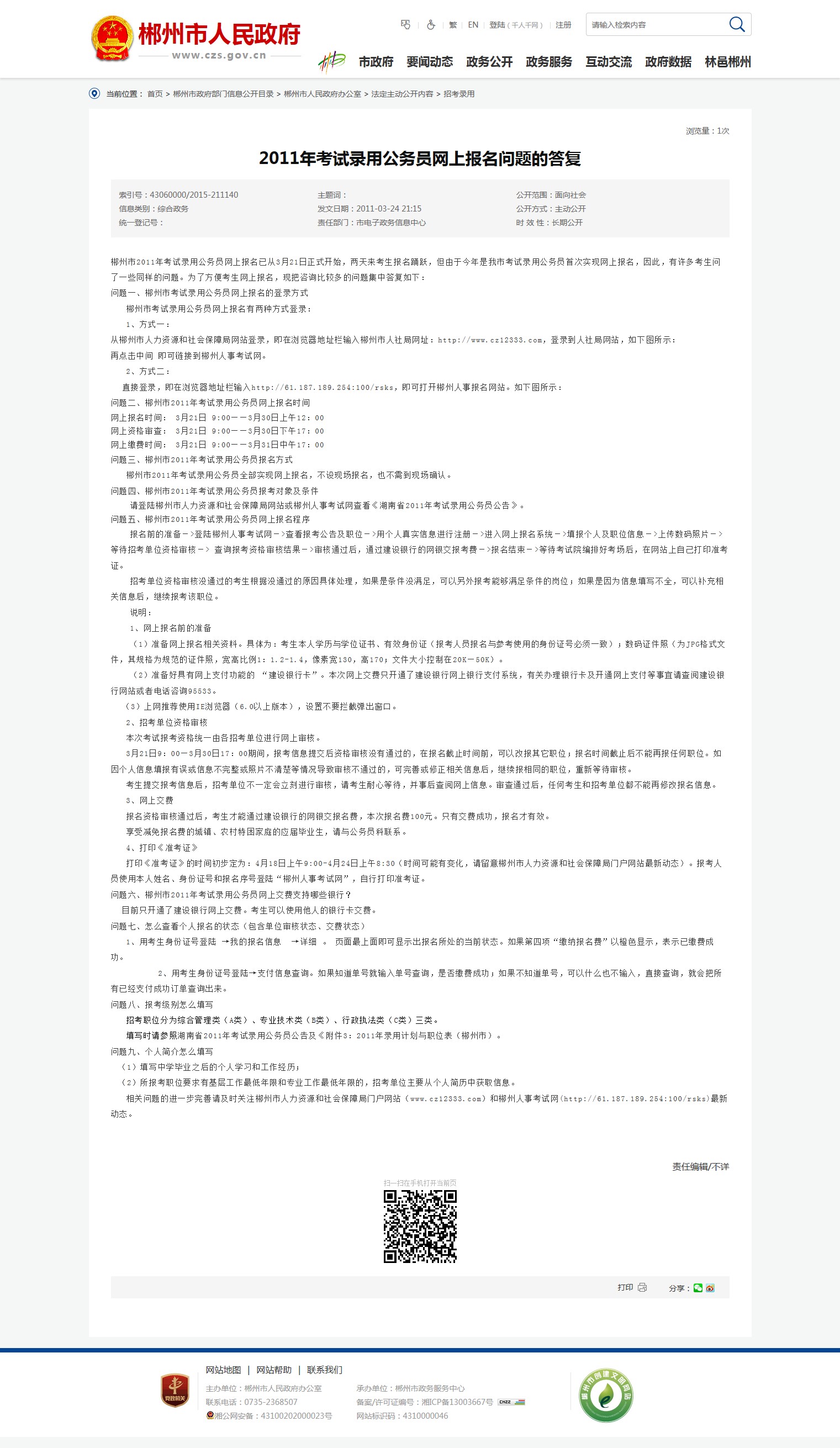 问题二、郴州市2011年考试录用公务员网上报名时间