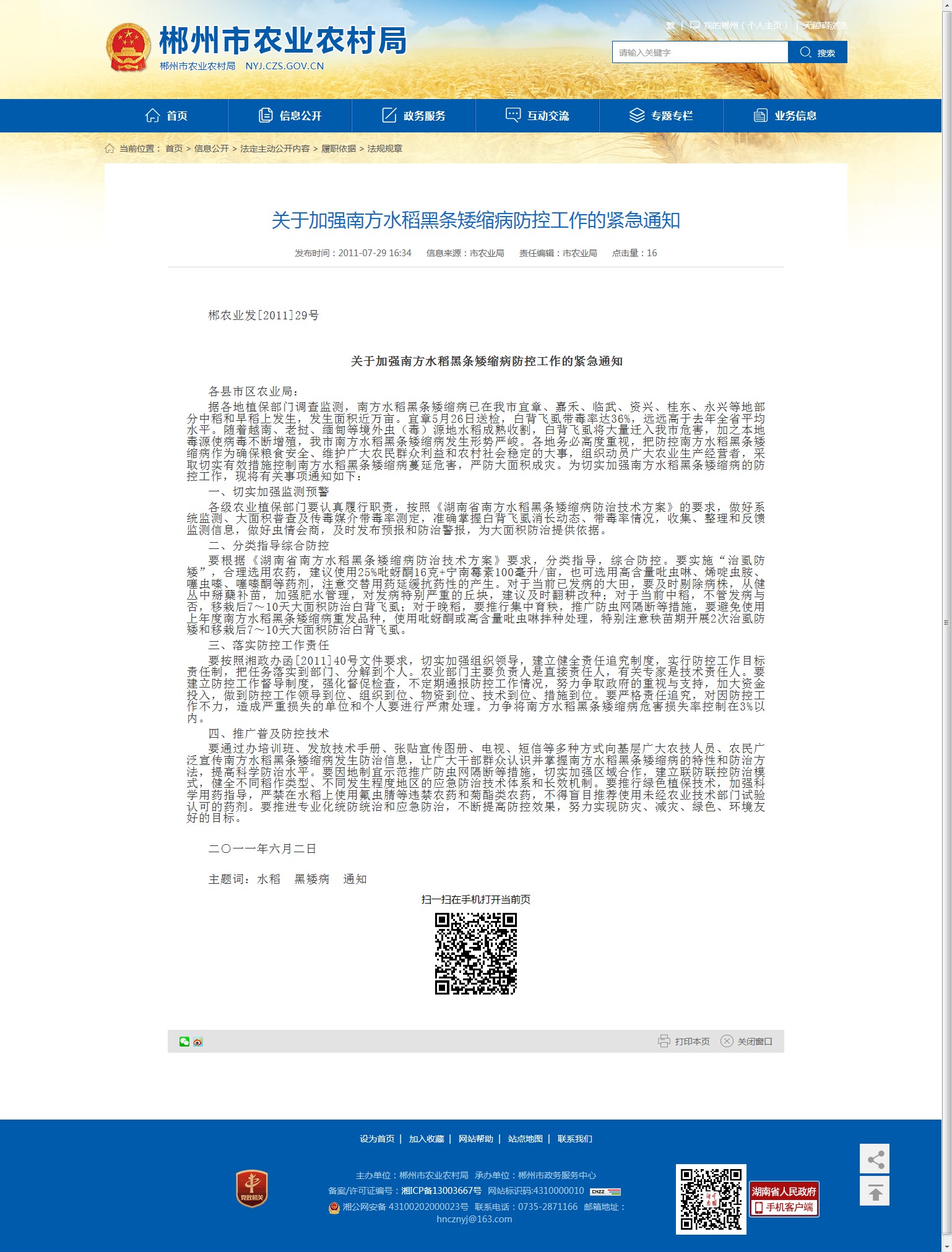 据各地植保部门调查监测,南方水稻黑条矮缩病已在我市宜章、嘉禾、临武、资兴、桂东、永兴等地部分中稻和早稻上发生,发生面积近万亩。宜章5月26日送检,白背飞虱带毒率达36%,远远高于去年全省平均水平。随着越南、老挝、缅甸等境外虫(毒)源地水稻成熟收割,白背飞虱将大量迁入我市危害,加之本地毒源使病毒不断增殖,我市南方水稻黑条矮缩病发生形势严峻。各地务必高度重视,把防控南方水稻黑条矮缩病作为确保粮食安全、维护广大农民群众利益和农村社会稳定的大事,组织动员广大农业生产经营者,采取切实有效措施控制南方水稻黑条矮缩病蔓延危害,严防大面积成灾。为切实加强南方水稻黑条矮缩病的防控工作,现将有关事项通知如下:
