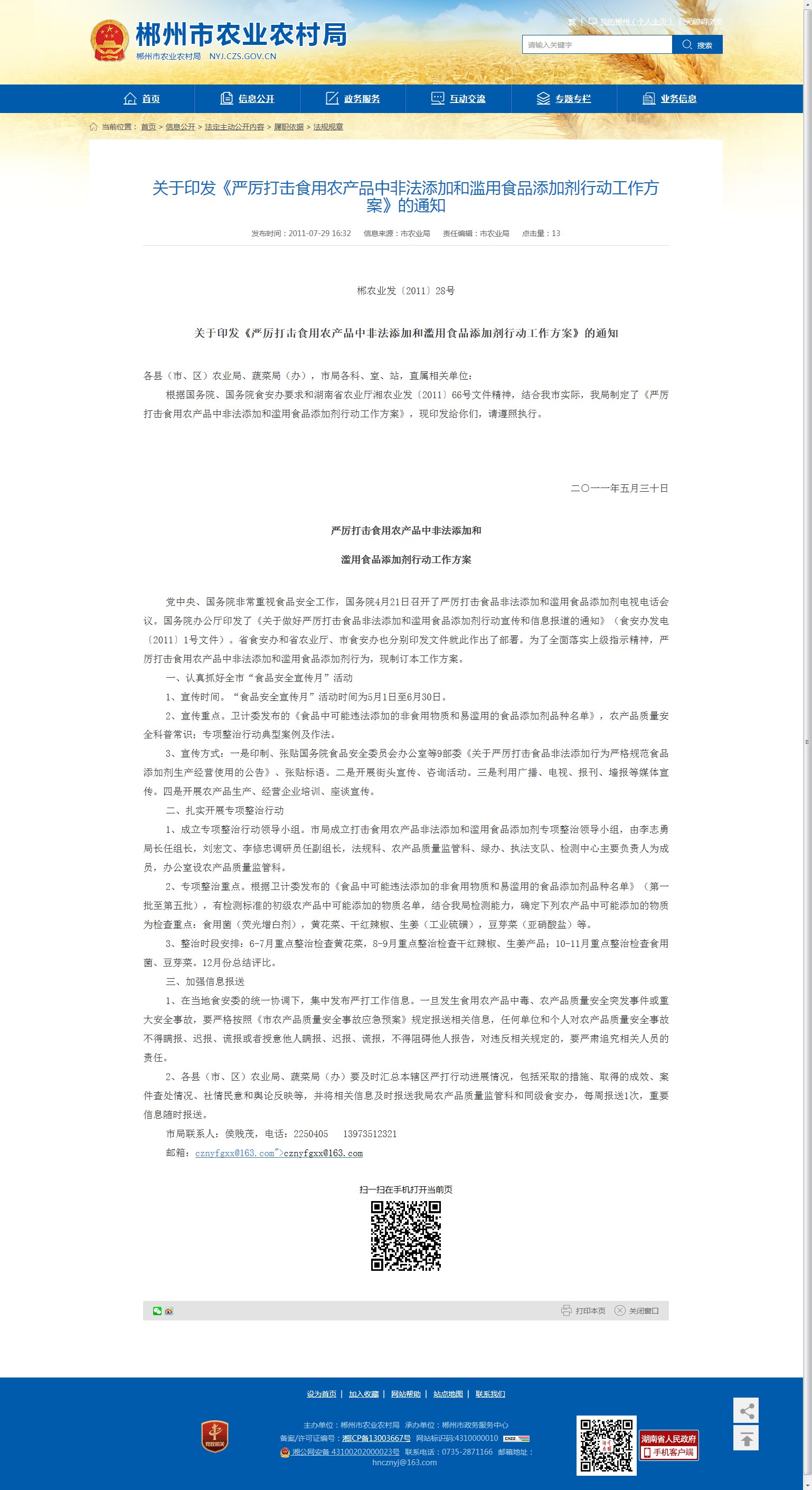 根据国务院、国务院食安办要求和湖南省农业厅湘农业发〔2011〕66号文件精神,结合我市实际,我局制定了《严厉打击食用农产品中非法添加和滥用食品添加剂行动工作方案》,现印发给你们,请遵照执行。