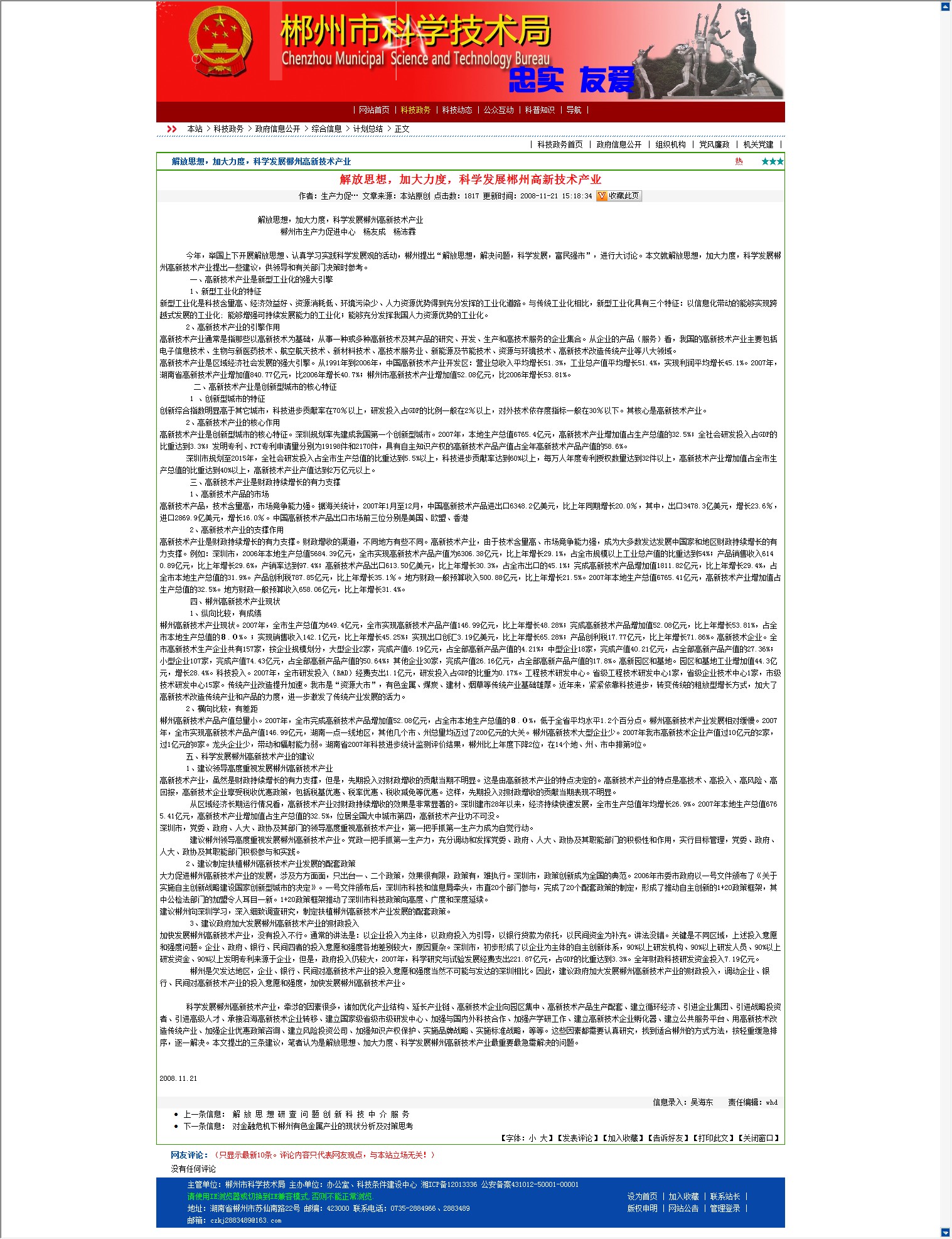 解放思想,加大力度,科学发展郴州高新技术产业